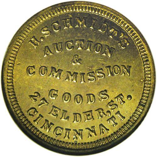<B>1863 H. Schmidt's, Fuld-OH-165FH-6b, R.7, Cincinnati, OH, MS64 NGC.</B></I> This is a richly toned R.7 example of this type of brass Civil War token. Mr. Schmidt was in the auction and commission goods business at 27 Elders St. in Cincinnati. Another very scarce issue with the 1042 reverse in brass. <BR><I>Ex Arthur C. Frits, Rosen Collection. From The Troy Wiseman Collection.</B></I>