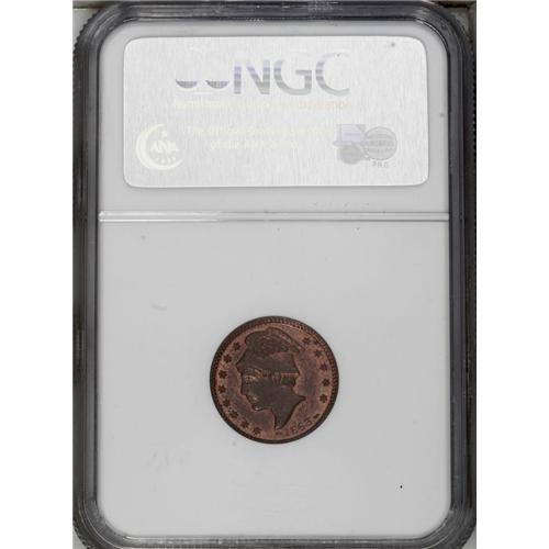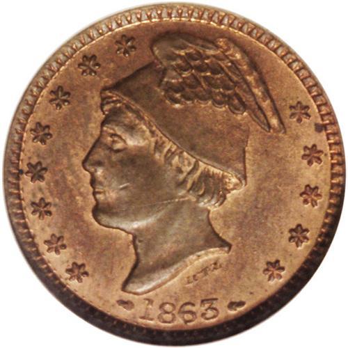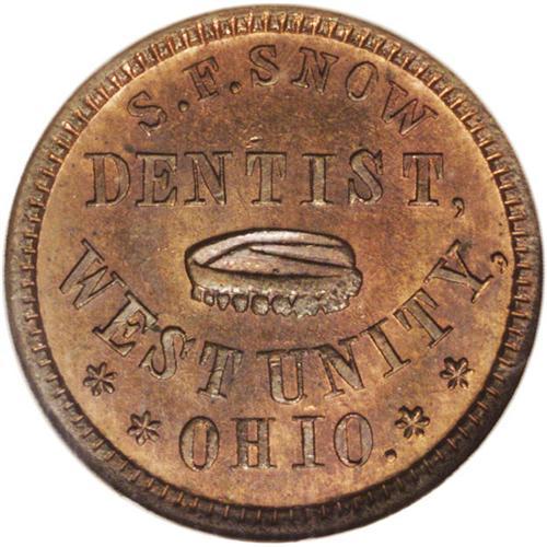 <B>1863 S.F. Snow, Dentist, Fuld-OH-930D-3a, R.6, West Unity, OH, MS64 NGC.</B></I> About 60% of the luster remains on this near-Gem example. There is a picture of a set of false teeth on the obverse.<BR><I>From The Troy Wiseman Collection.</B></I>