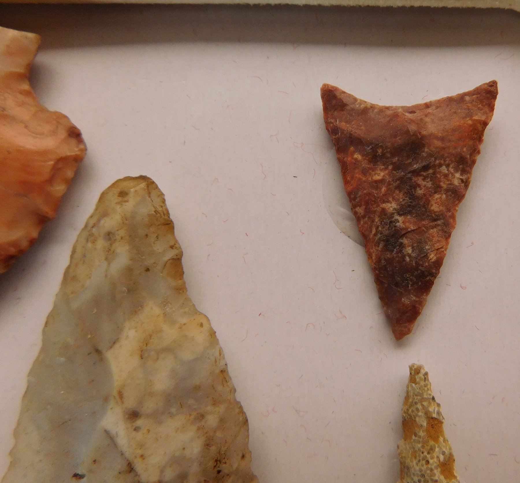 Ohio Artifact Collection, pre-historic items. Made of flint ridge flint, the longest item measures 3 3/4". Ross County, Ohio. Frame included. Condition: As found, see images. Shipping: $15.50 w/insurance and signature.