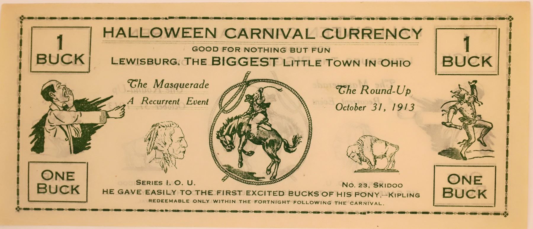 Rare piece of "Halloween Carnival Currency, Good for Nothing but Fun, Lewisburg, the Biggest Little Town in Ohio." Advertises a masquerade and a round-up on October 31, 1913. Has images of a yelling man, a Native American, a cowboy riding a bucking horse, a buffalo, and a jester. Printed in green ink on one side and black on the other. 7.5 x 3.25, very good condition. City: State: Date:1913