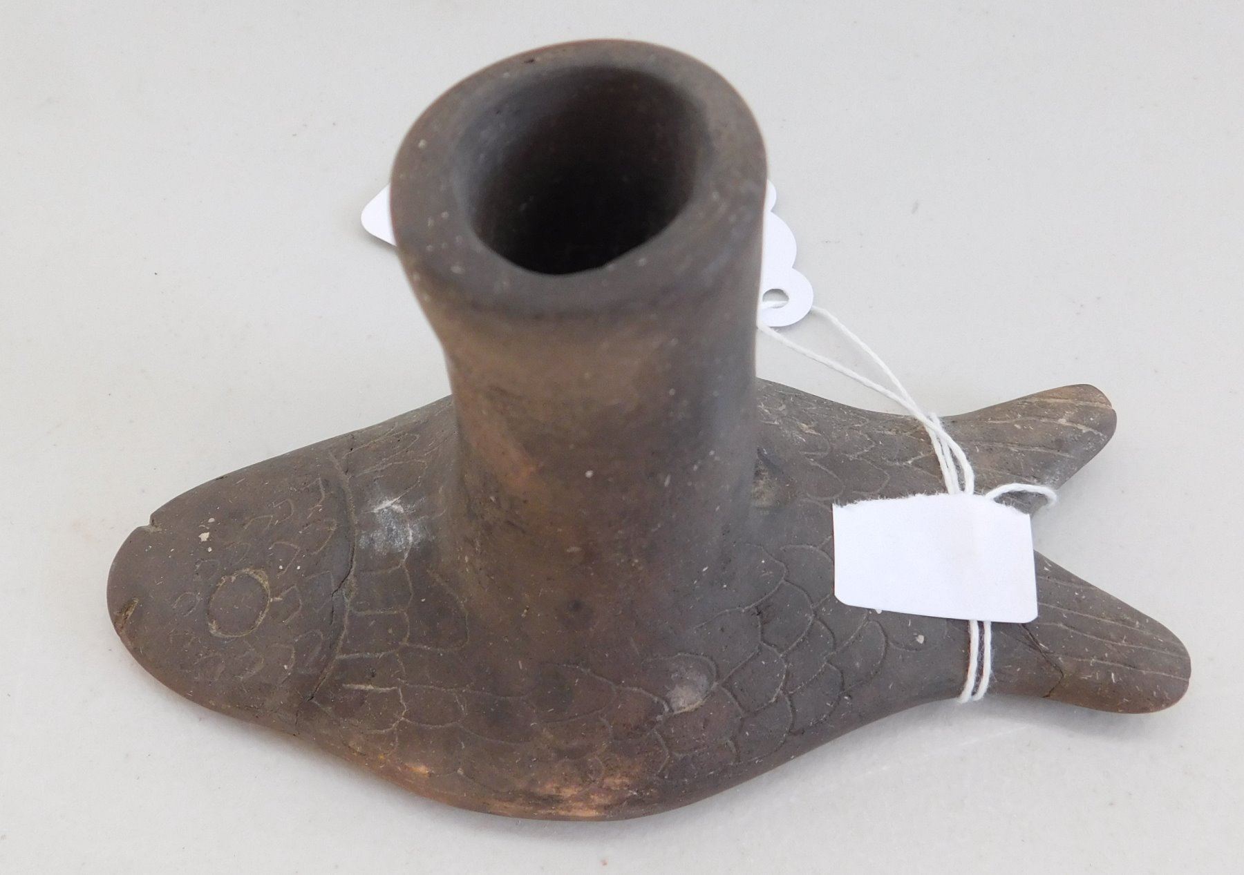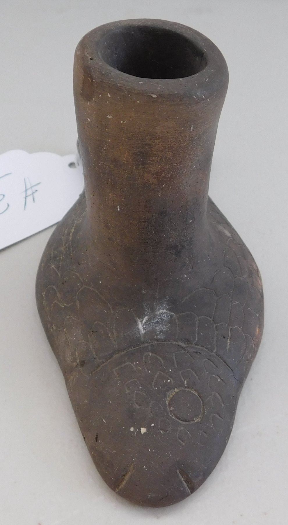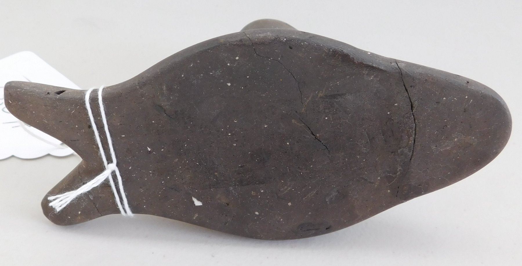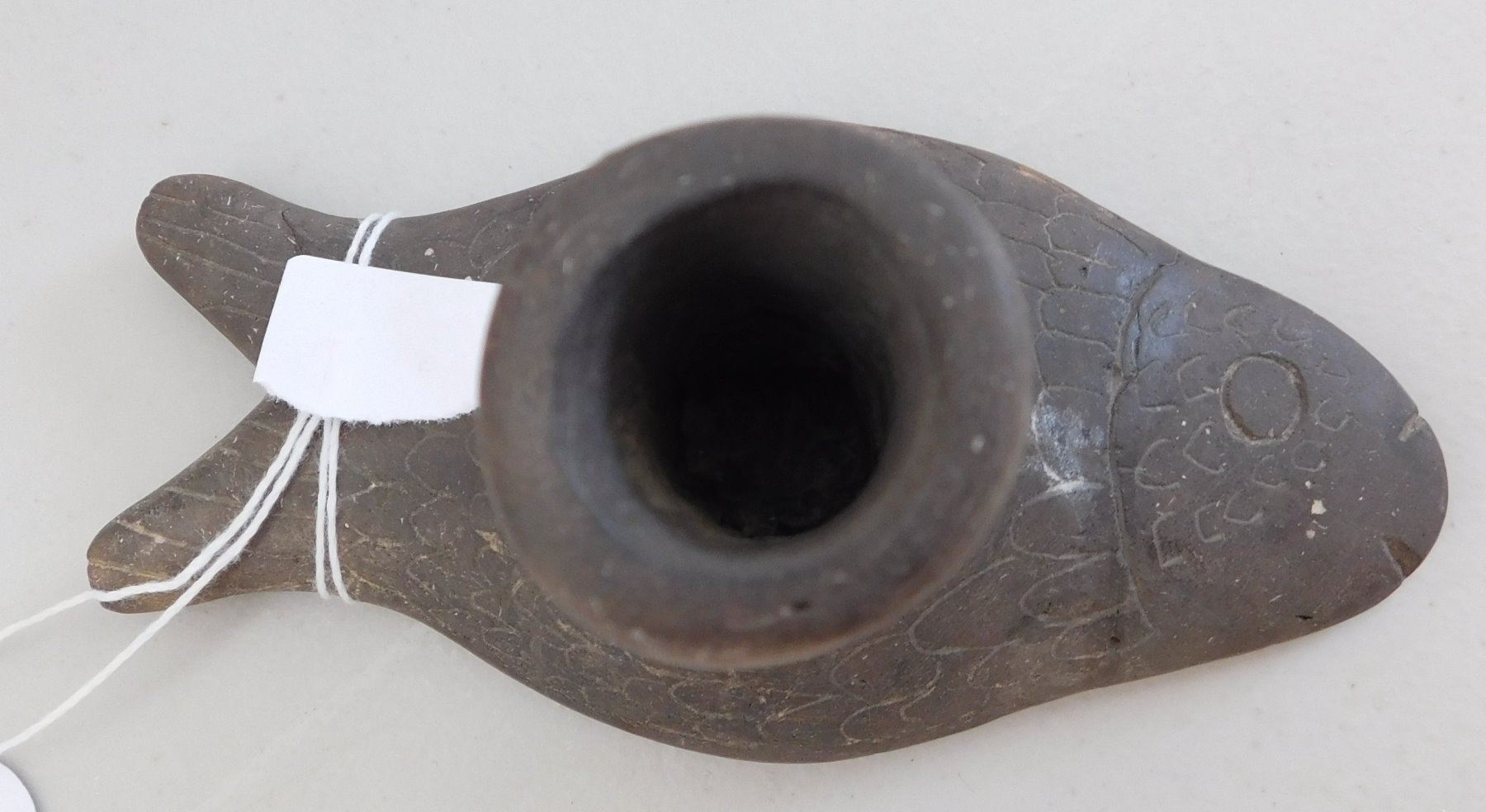 Ohio Clay Fish Pipe, Hopewell era. Made of clay and measuring 5.5" x 3" x 2.5". Scioto County, Ohio. Nice fish with engraving. Condition: Broken and reglued, see images. Shipping: $22.50 w/insurance and signature.
