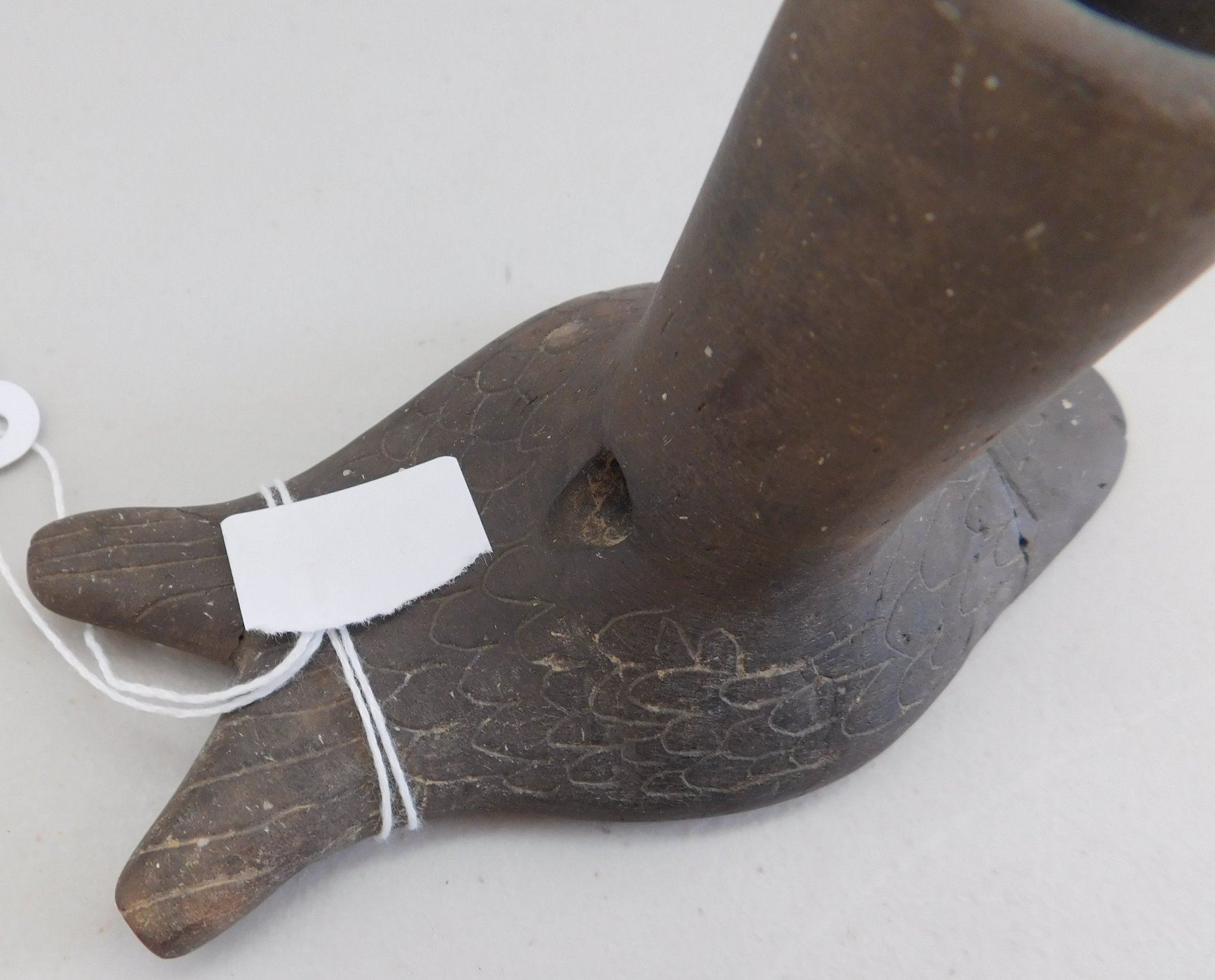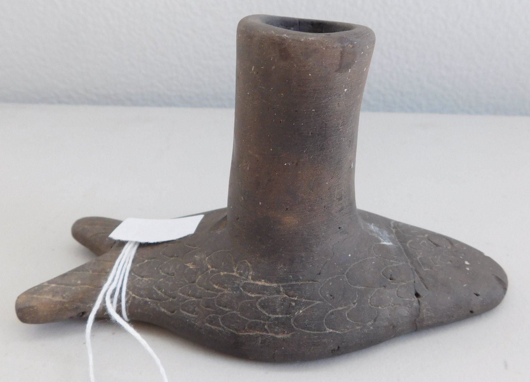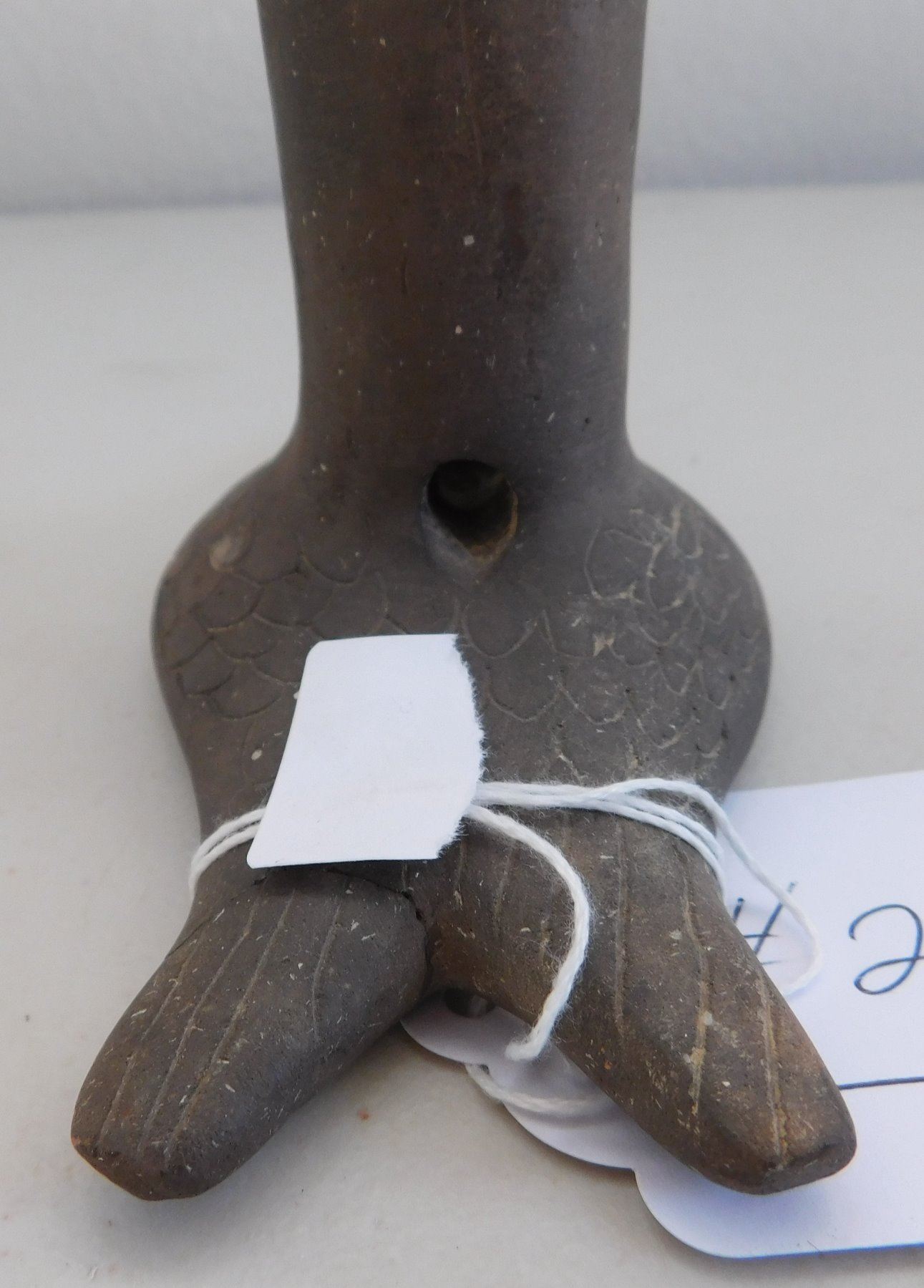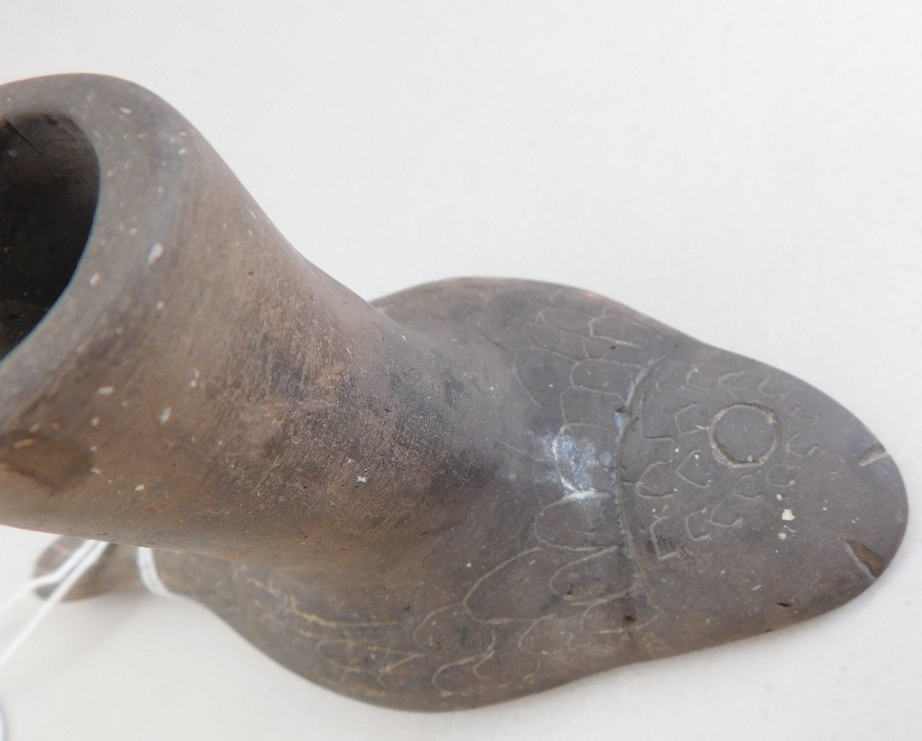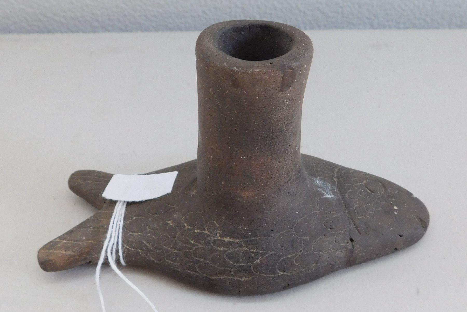 Ohio Clay Fish Pipe, Hopewell era. Made of clay and measuring 5.5" x 3" x 2.5". Scioto County, Ohio. Nice fish with engraving. Condition: Broken and reglued, see images. Shipping: $22.50 w/insurance and signature.