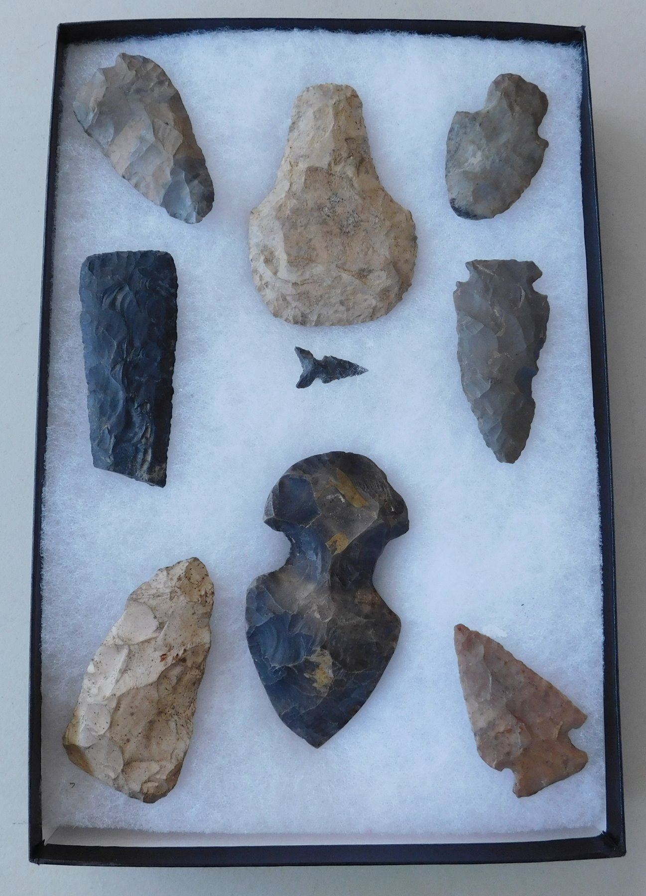 Ohio Flint Collection, archaic period. Made of chert, the largest knife is 4 1/4" long. Scioto County, Ohio. Frame not included. Condition: As found, see images. Shipping: $27.50 w/insurance and signature.