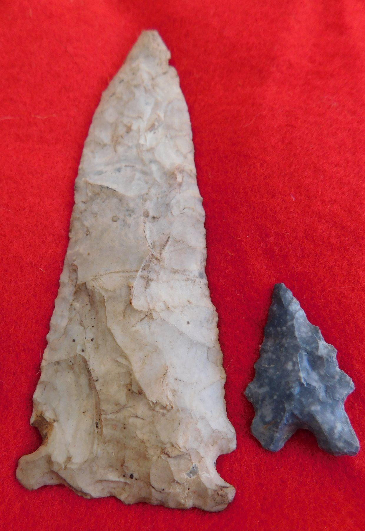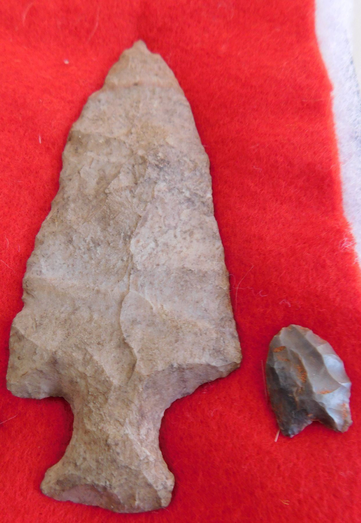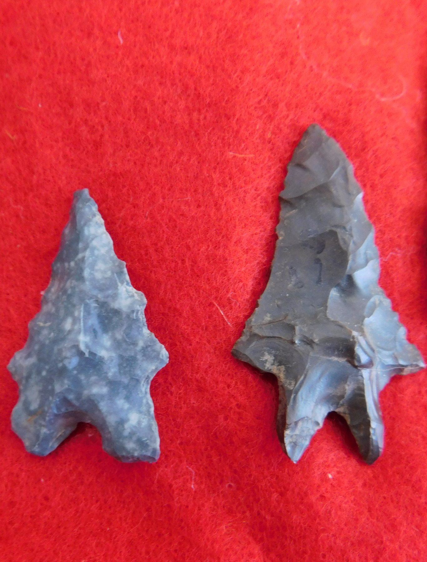 Ohio Flint Collection, archaic period. Made of flint and chert, the bent is 4.75" long. Scioto County, Ohio. One appears to be an Ashtabula, the other a dovetail. Frame not included. Condition: As found, see images. Shipping: $25.50 w/insurance and signature.