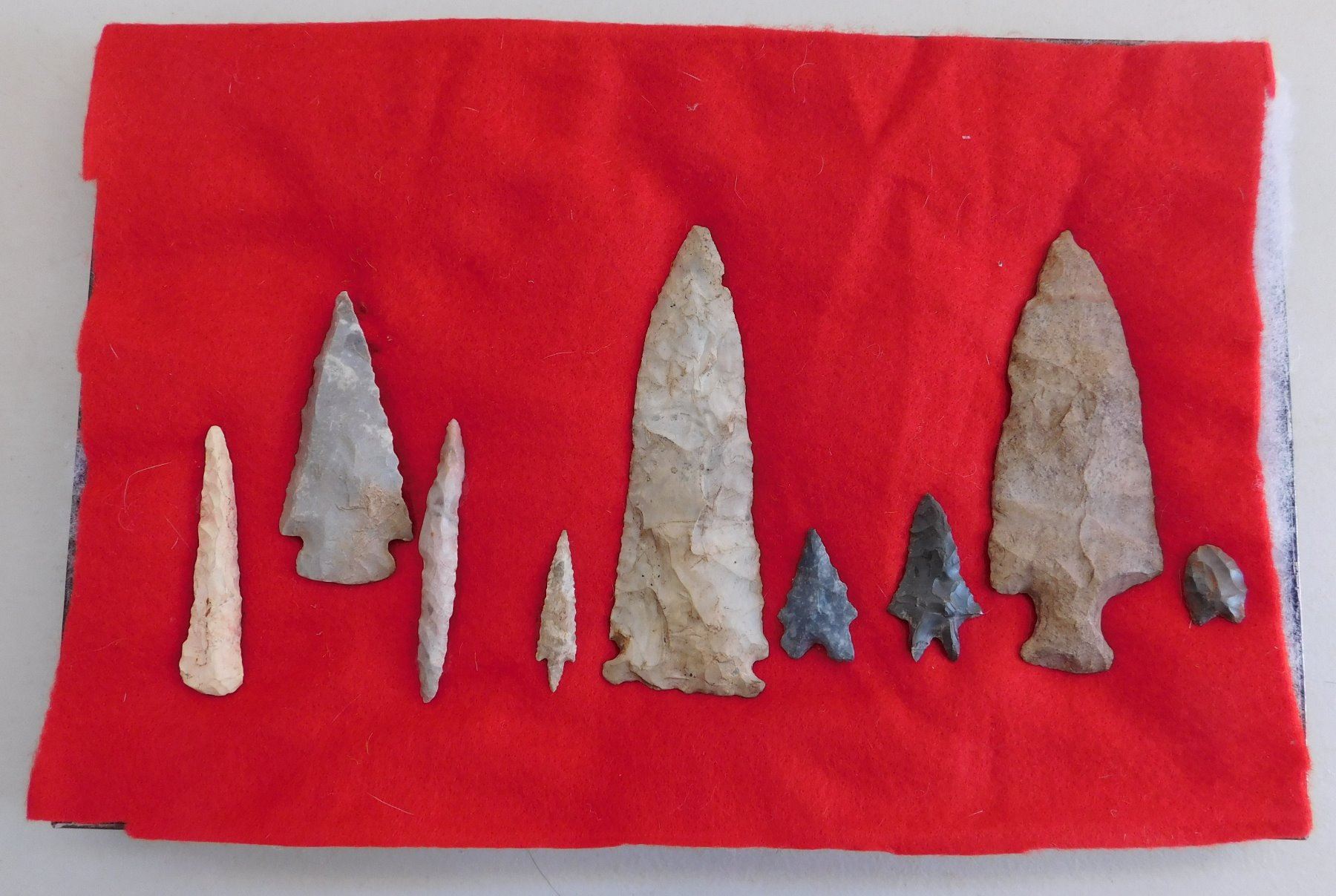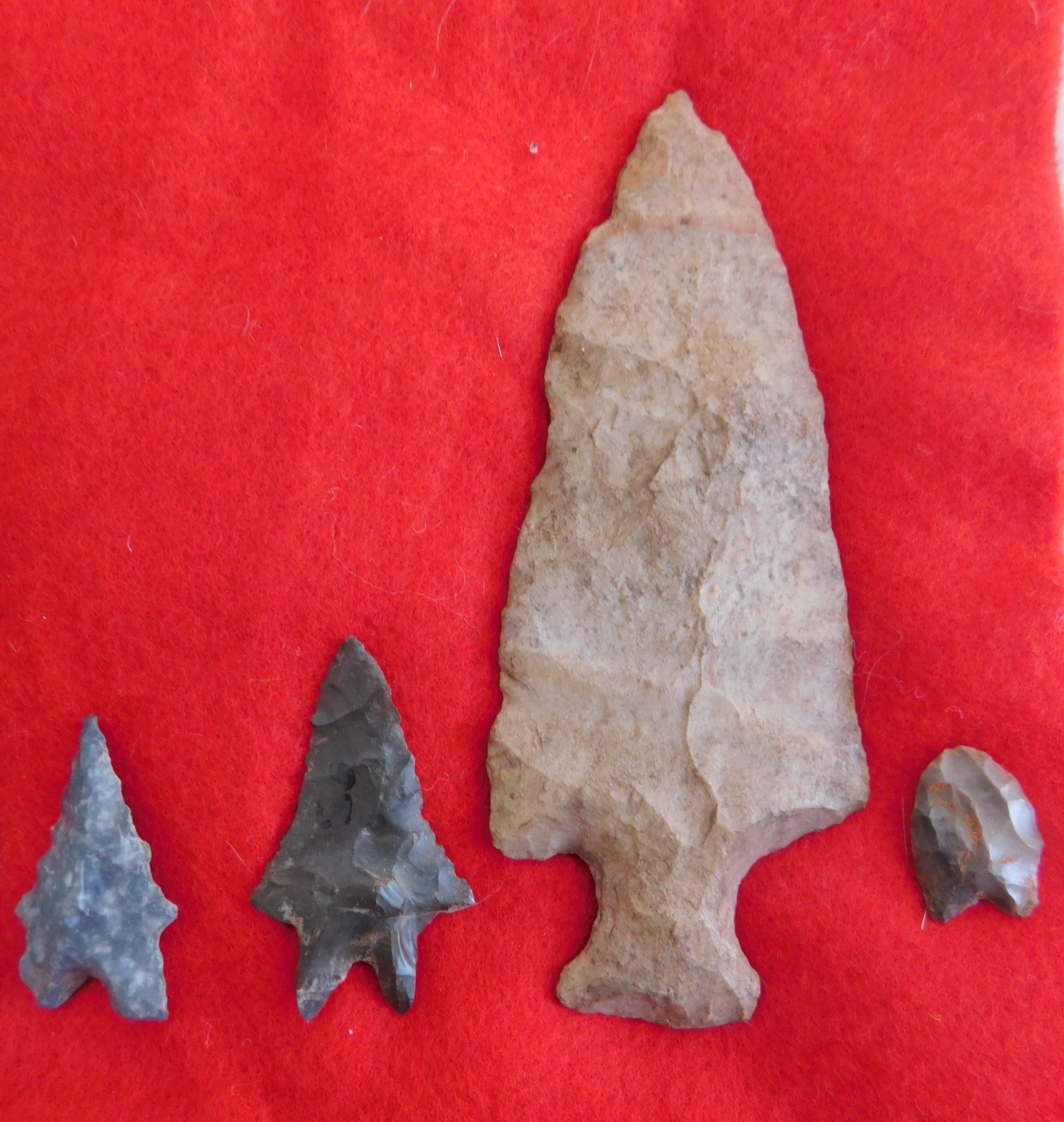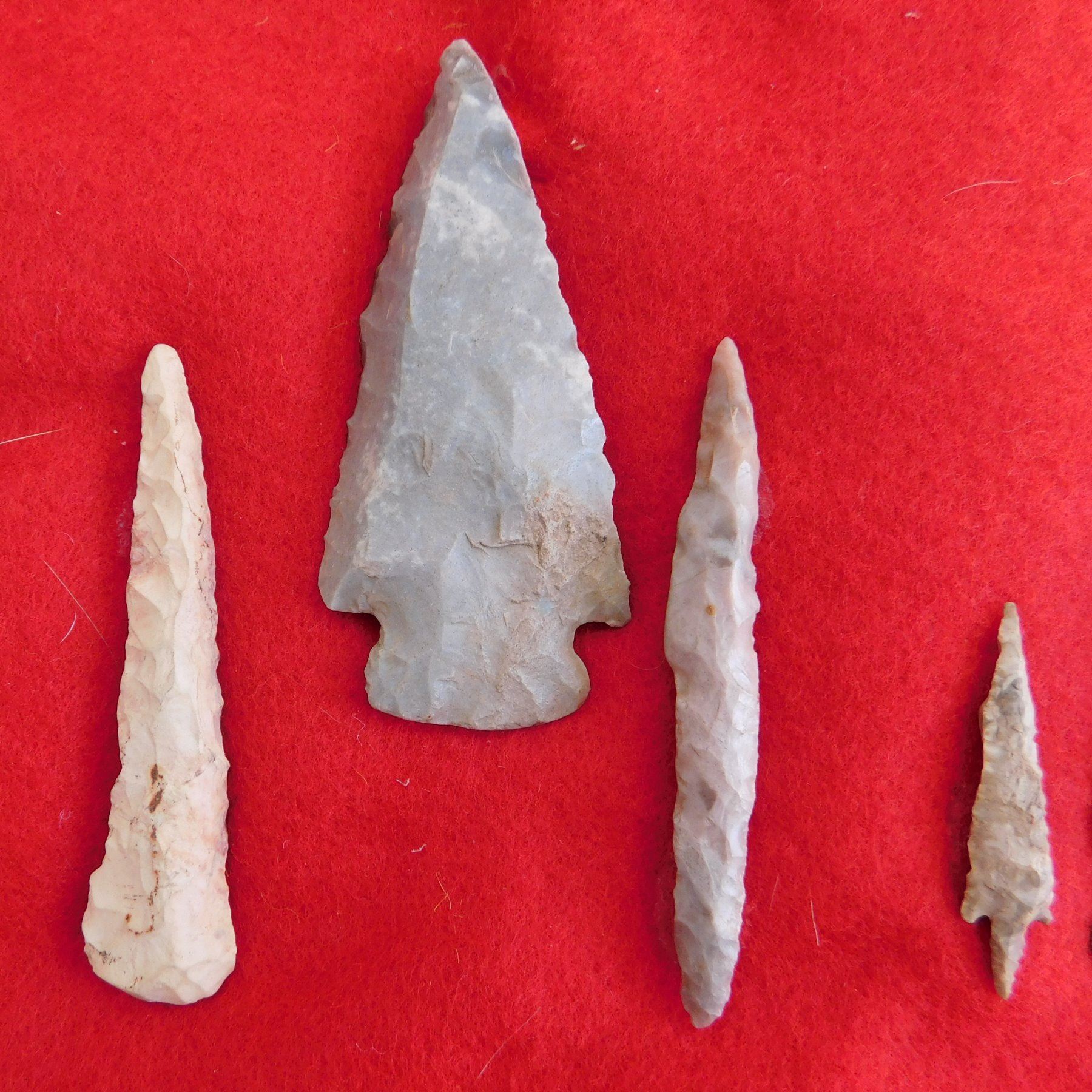 Ohio Flint Collection, archaic period. Made of flint and chert, the bent is 4.75" long. Scioto County, Ohio. One appears to be an Ashtabula, the other a dovetail. Frame not included. Condition: As found, see images. Shipping: $25.50 w/insurance and signature.