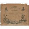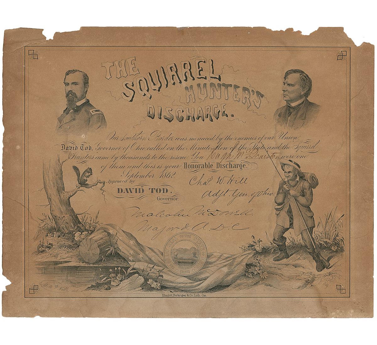 Partly-printed DS, one page, 11.25 x 9, September 1862. A discharge certificate featuring engraved images of General Lew Wallace and Governor David Tod of Ohio bearing facsimile signatures of Charles W. Hill and Malcolm McDonnell. In part: “Our Southern Border was menaced by the enemies of our Union. David Tod, Governor of Ohio called on the Minute Men of the State and the ‘Squirrel Hunters’ came by thousands to the rescue. You, Hugh McQuiston, were one of them and this is your Honorable Discharge.” Significant overall dampstaining and toning, several tape-repaired tears, and chipping to edges, otherwise very good condition. The ‘Squirrel Hunters’ were a ragtag militia assembled to fend off Confederate forces when they threatened to capture Cincinnati in the fall of 1862. Despite no official training or standard-issue weaponry, they were commended as able marksmen who ‘never had to shoot at the same squirrel twice.’