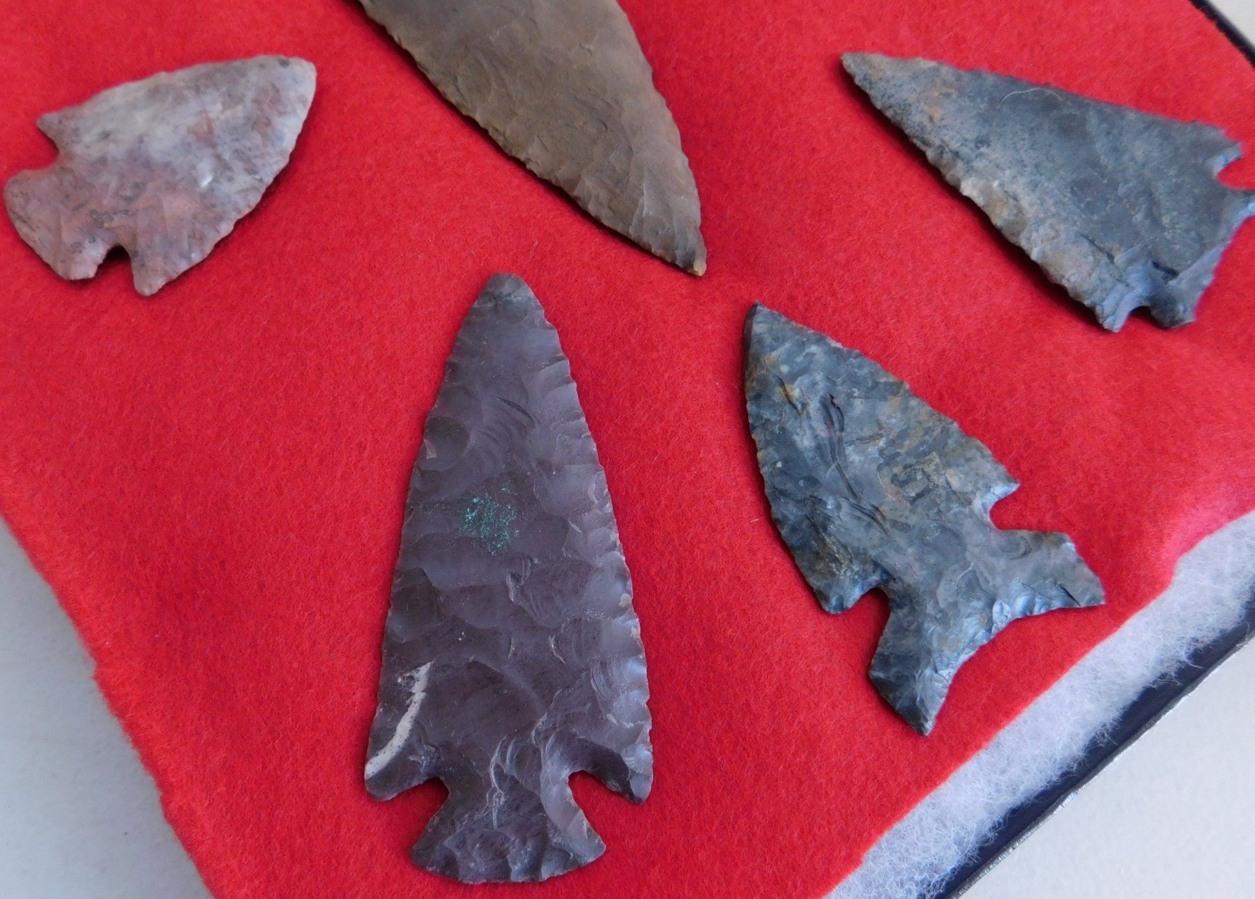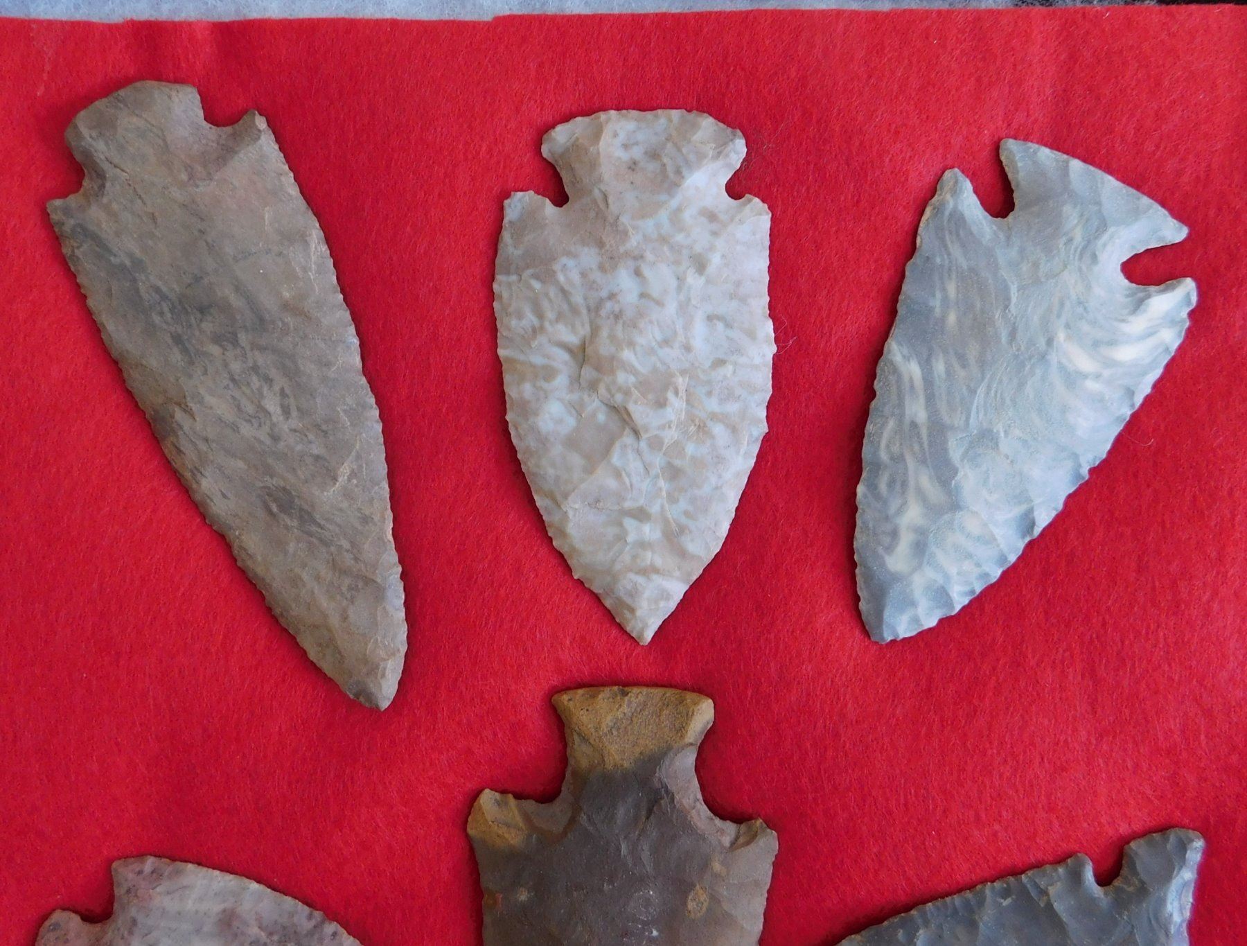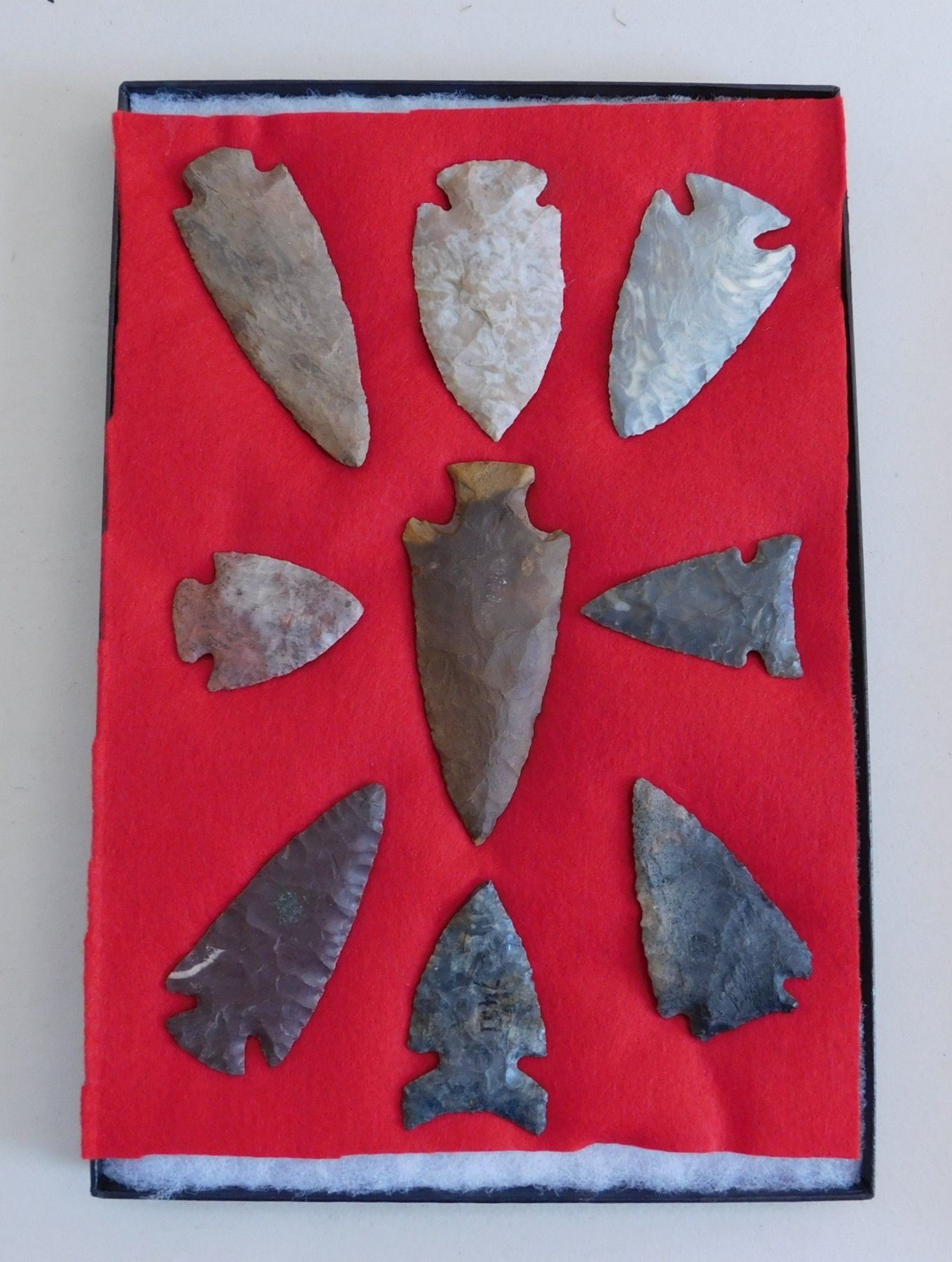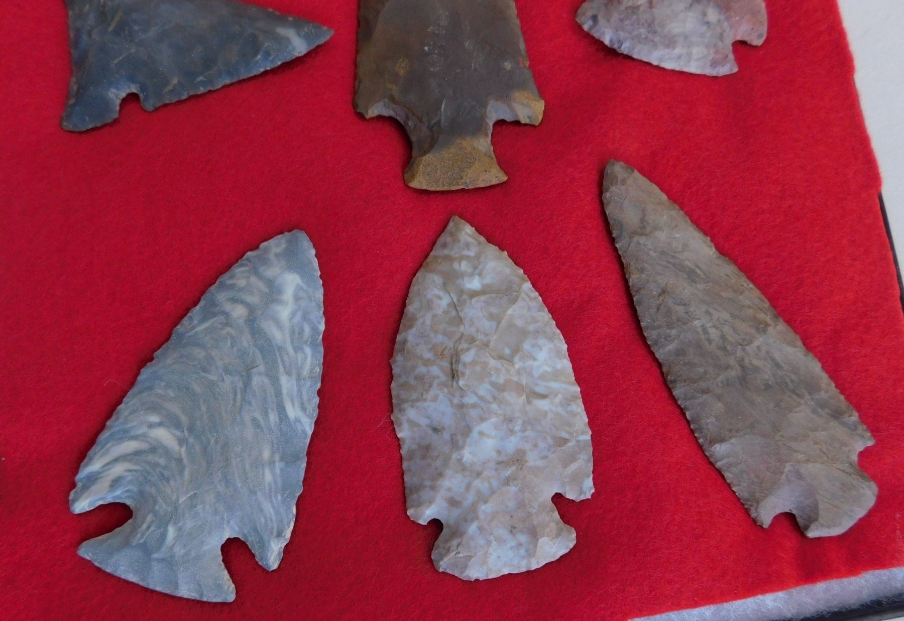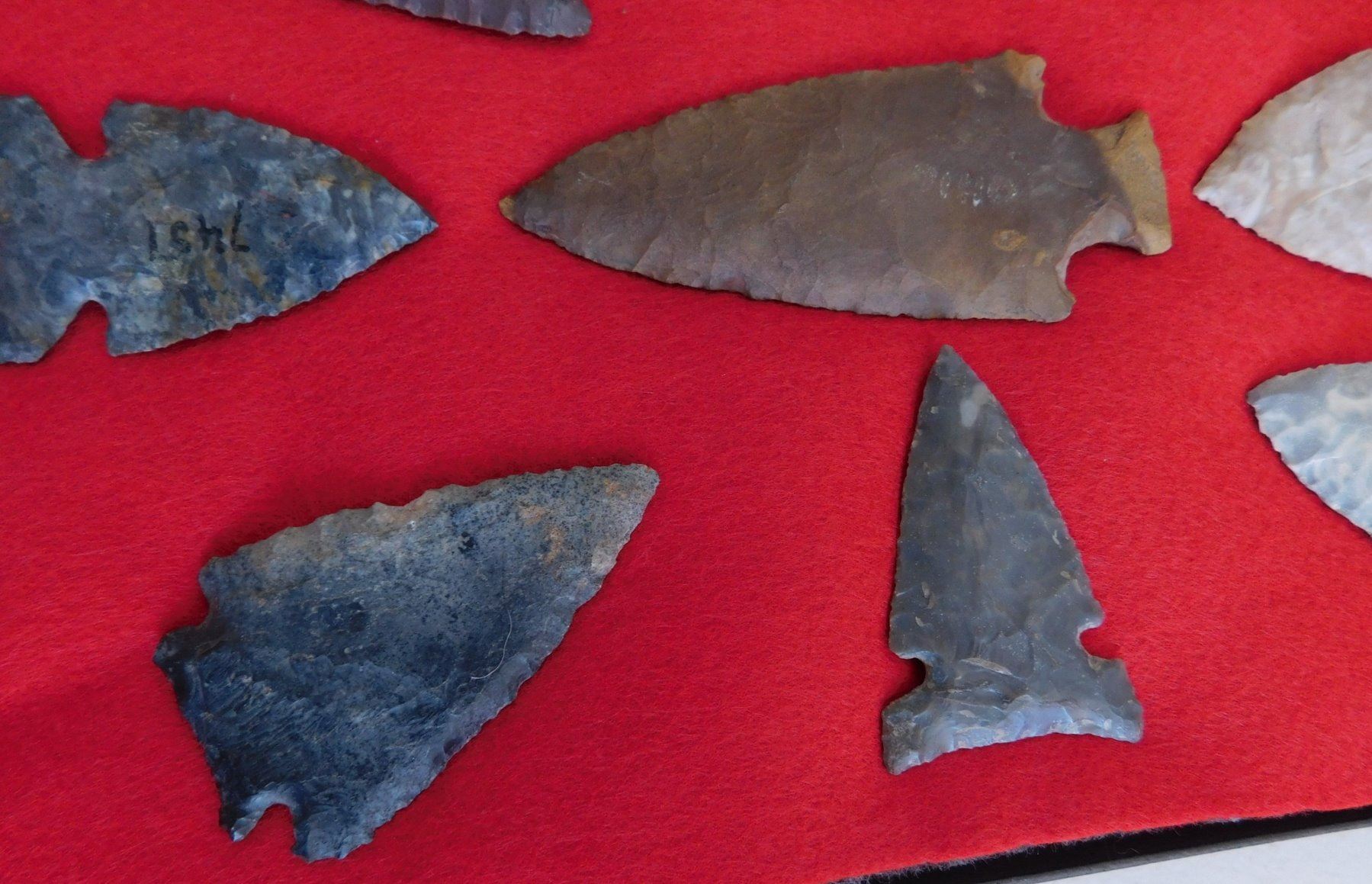 Ohio Lost Lakes Collection, archaic period. Made of chert, the items are 2" to 4" long. Delaware County, Ohio. Nice group of notched spears. Frame not included. Condition: As found, most good, see images. Shipping: $24.50 w/insurance and signature.