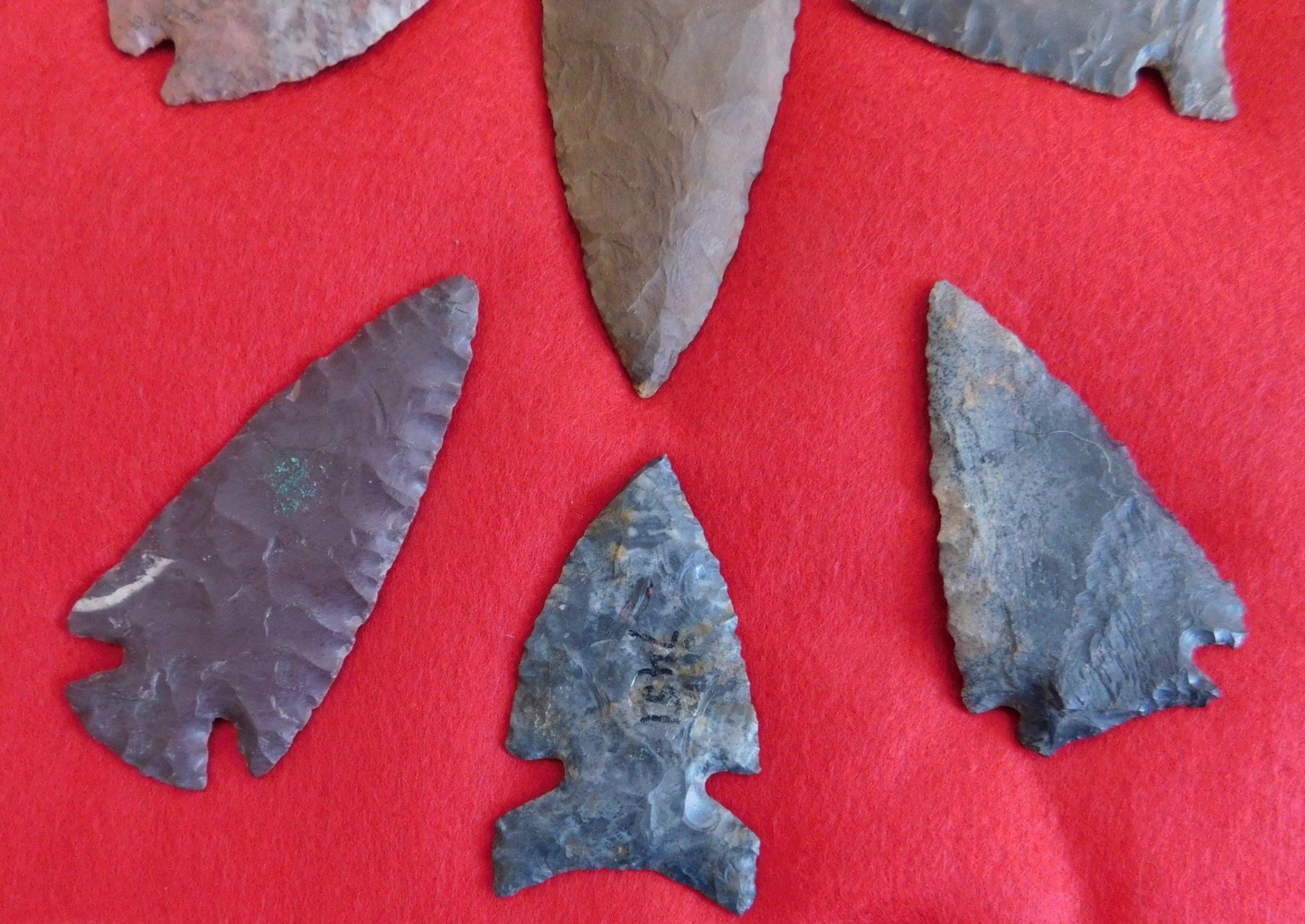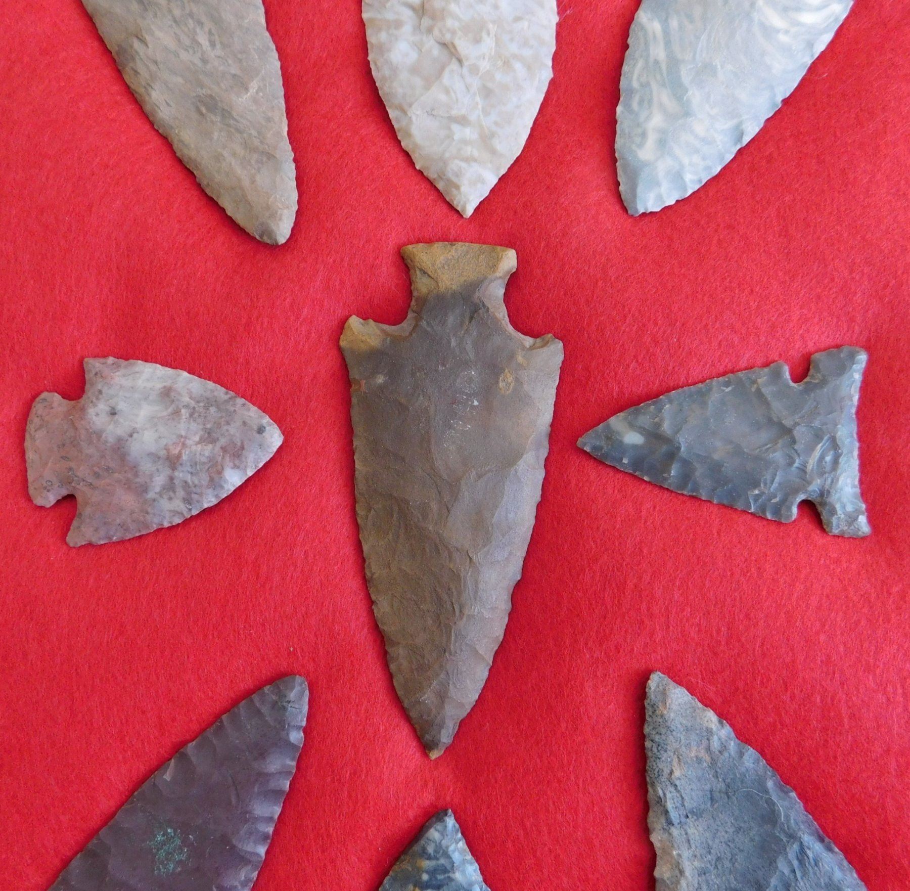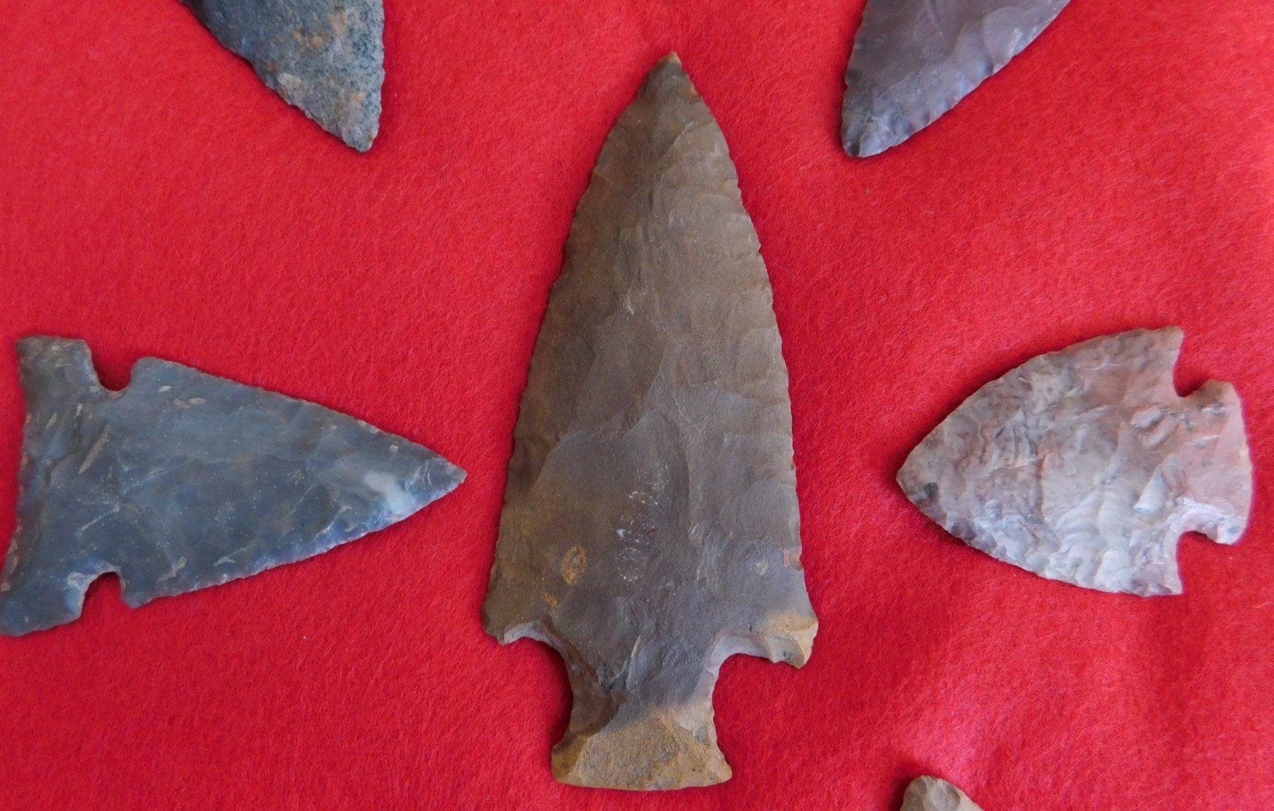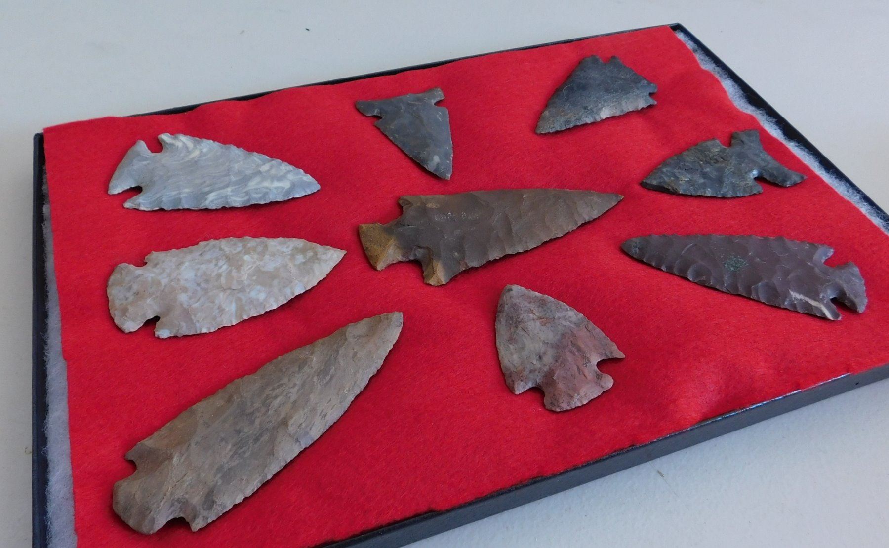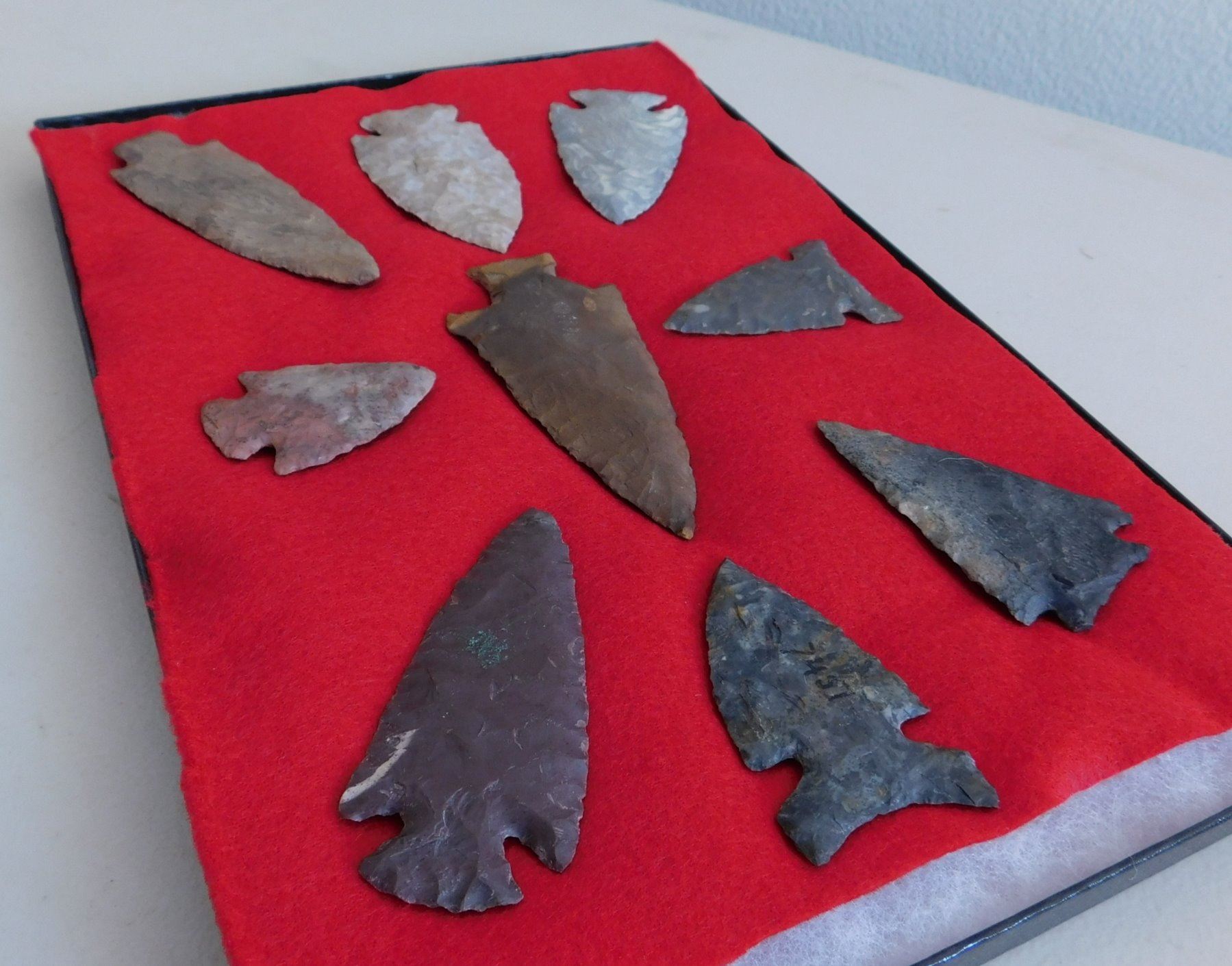Ohio Lost Lakes Collection, archaic period. Made of chert, the items are 2" to 4" long. Delaware County, Ohio. Nice group of notched spears. Frame not included. Condition: As found, most good, see images. Shipping: $24.50 w/insurance and signature.