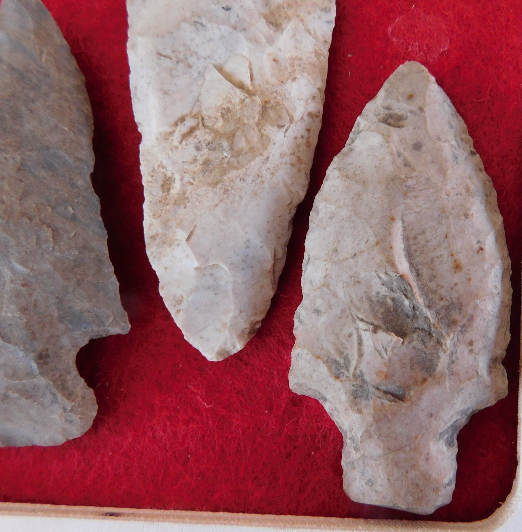 Ohio Points Collection, pre-historic items. Made of chert, the longest item measures 3 3/4". Ross County, Ohio. Nice Stanfield point, frame included. Condition: As found, see images. Shipping: $15.50 w/insurance and signature.