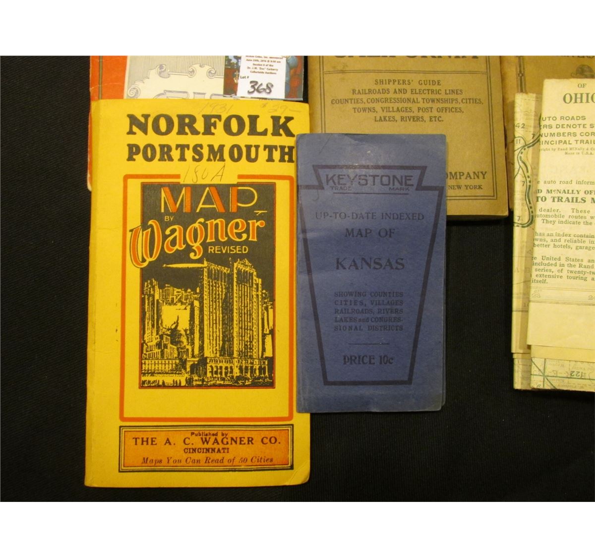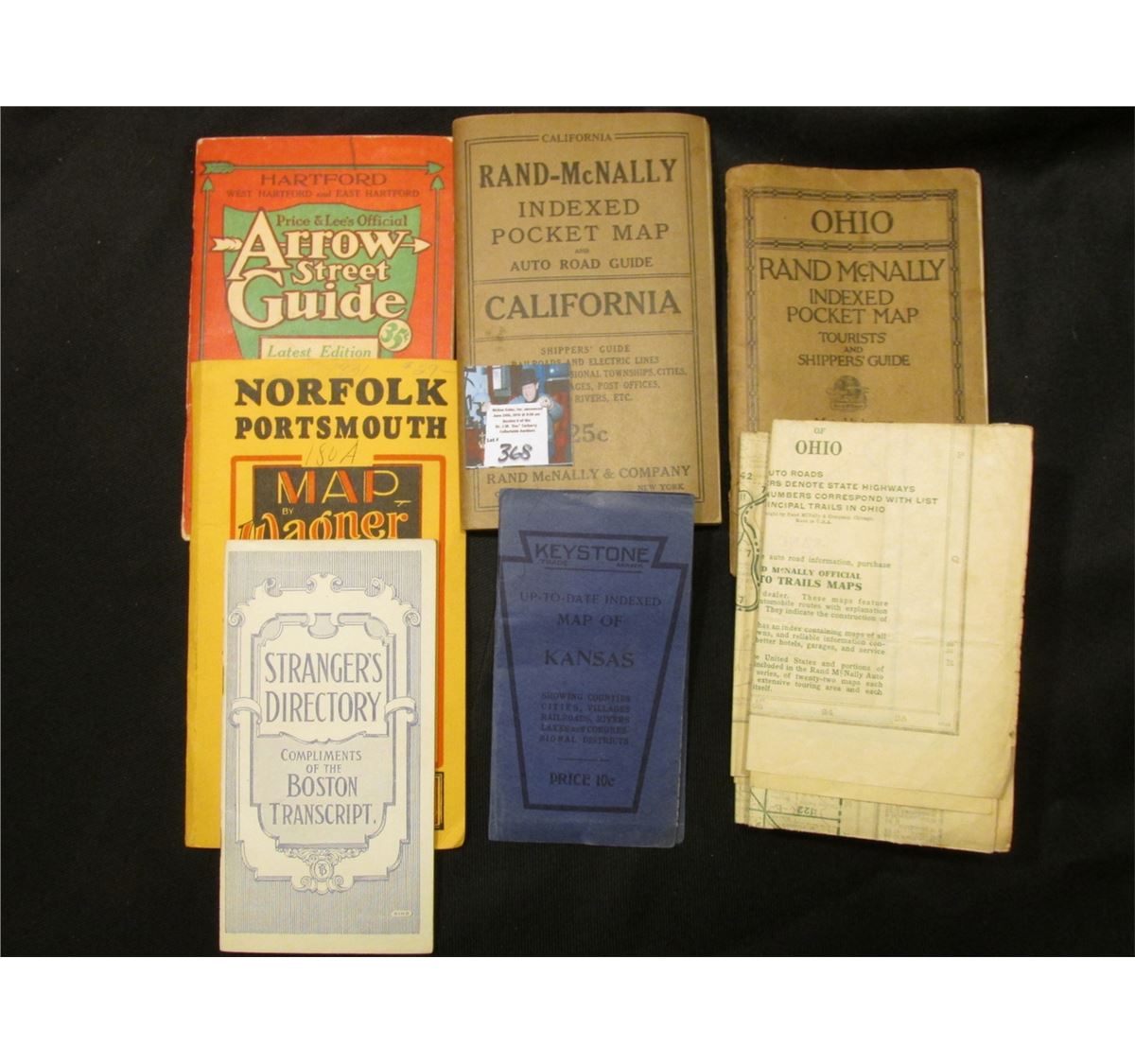 "Ohio" Rand McNally Map; "Rand McNally Indexed Pocket Map…and Shippers' Guide of Ohio"; 1905 "Keystone Up-To-Date Indexed Map of Kansas"; 1910 "Rand McNally Indexed Pocket Map…and Shippers' Guide of California"; "Stranger's Directory Compliments of the Boston Transcript" (Map); 1931 Norfolk Portsmouth Map by Wagner; & Hartford West Hartford and East Hartford Price & Lee's Official Arrow Strret Guide".