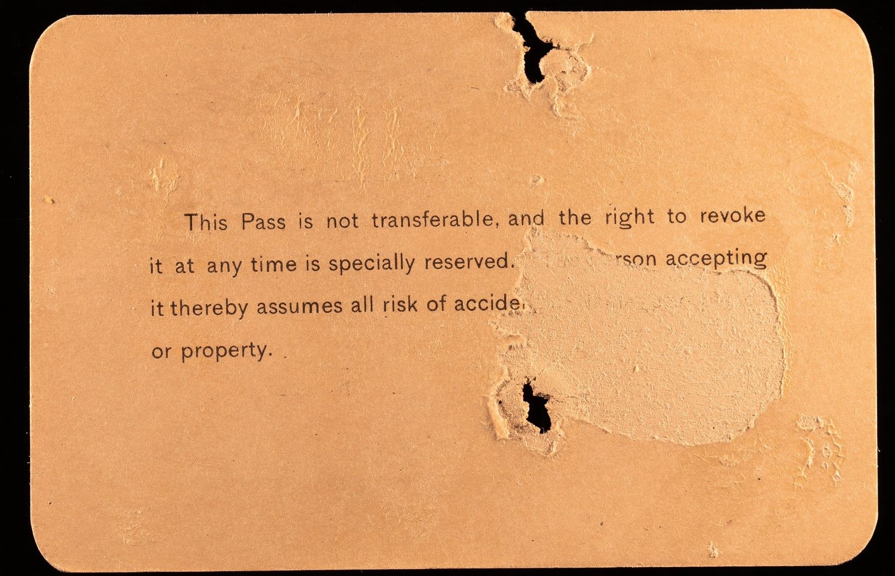 1893 pass with orange steamer vignette. Chip and small hole, adhesive thinning on reverse. Please inspect.
