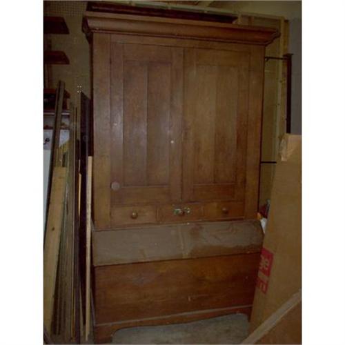 This is a community size cupboard. Shakers often did the baking for the community in the basement. Due to the moisture there was damage to the feet and some to back side. Doors, drawers and other cabinet main wood is butternut. Secondary wood is pine. I will be adding info. to this listing in the next week or so.