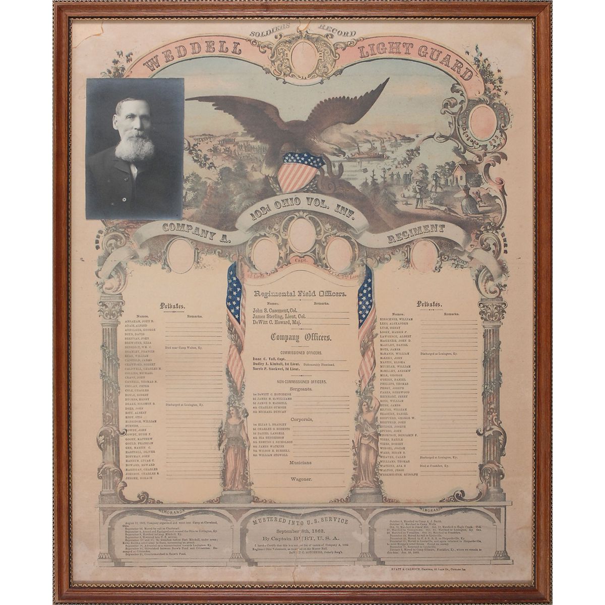 Printed soldier’s record broadside for the Weddell Light Guard, Company A of the 103rd Ohio Volunteers, 17.5 x 21.5, featuring lists of privates and officers in the regiment, as well as a timeline of their movements from between August 13, 1862, and January 29, 1863. The top of the document bears a gorgeous, colorful engraved patriotic vignette, as well as an affixed portrait of a gentleman (presumably one of the officers). Document is affixed to a backing and framed to an overall size of 19 x 23. In very good condition, with scattered areas of toning from adhesive to reverse, noticeable tears to the top and bottom edges, and paper loss to the upper left corner.