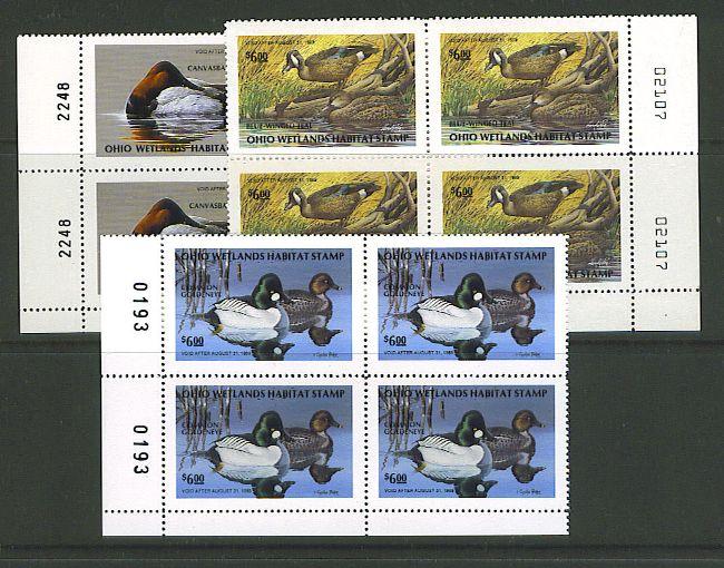 Three different post office fresh Ohio State Duck stamp plate blocks incl. OH5-OH7. All have VF or better centering and all are OG NH. 2008 SCV.$216