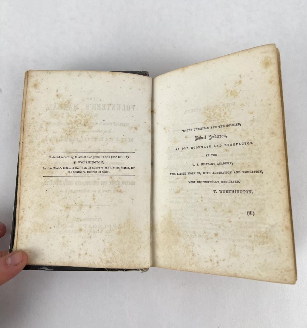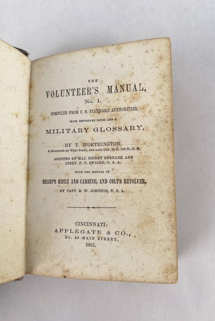 The Volunteers Manual No I. Compiled from US Standard Authorities with Important Notes and a Military Glossary. T. Worthington 1861. With the Manual of Sharp's Rifle and Carbine, and Colt's Revolver. Named to Michael A. Sweetman, Company K, 114th O.V.I.