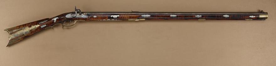 Ohio-style American full-stock percussion Kentucky rifle with ornate engraved silver and brass inlays. Unsigned. The rifle measures 54” overall, with 38-1/2” medium to slightly heavy weight octagon barrel ofapprox. .46 caliber. 8-groove, deeply rifled. The barrel measures almost exactly an inch across the flats. The barrel is nicely engraved with florals and panel for maker’s signature, which may have been lightly signed but now is not visible. The rifle shows nicely striped stock with minor repairs and light refinishing. The patchbox is lightly engraved and pierced, made in 4 pieces. The lock is lightly engraved and in the Americanstyle. The area of bolster has a brass flash-protector inlaid behind it and to the breech, and there may have been a repair in this area. The left side of the stock shows a nicely engraved eagle surrounded by twoacorns and pearl inlay. Also figures of dog, bird, spangles, florals, fish, and other folk-type decorations. Approx. 25 engraved silver inlays. The tang is drilled for a peep-type sight which is now missing, and the
