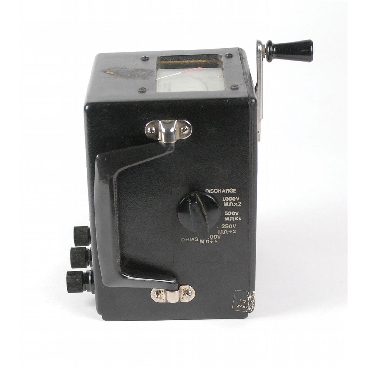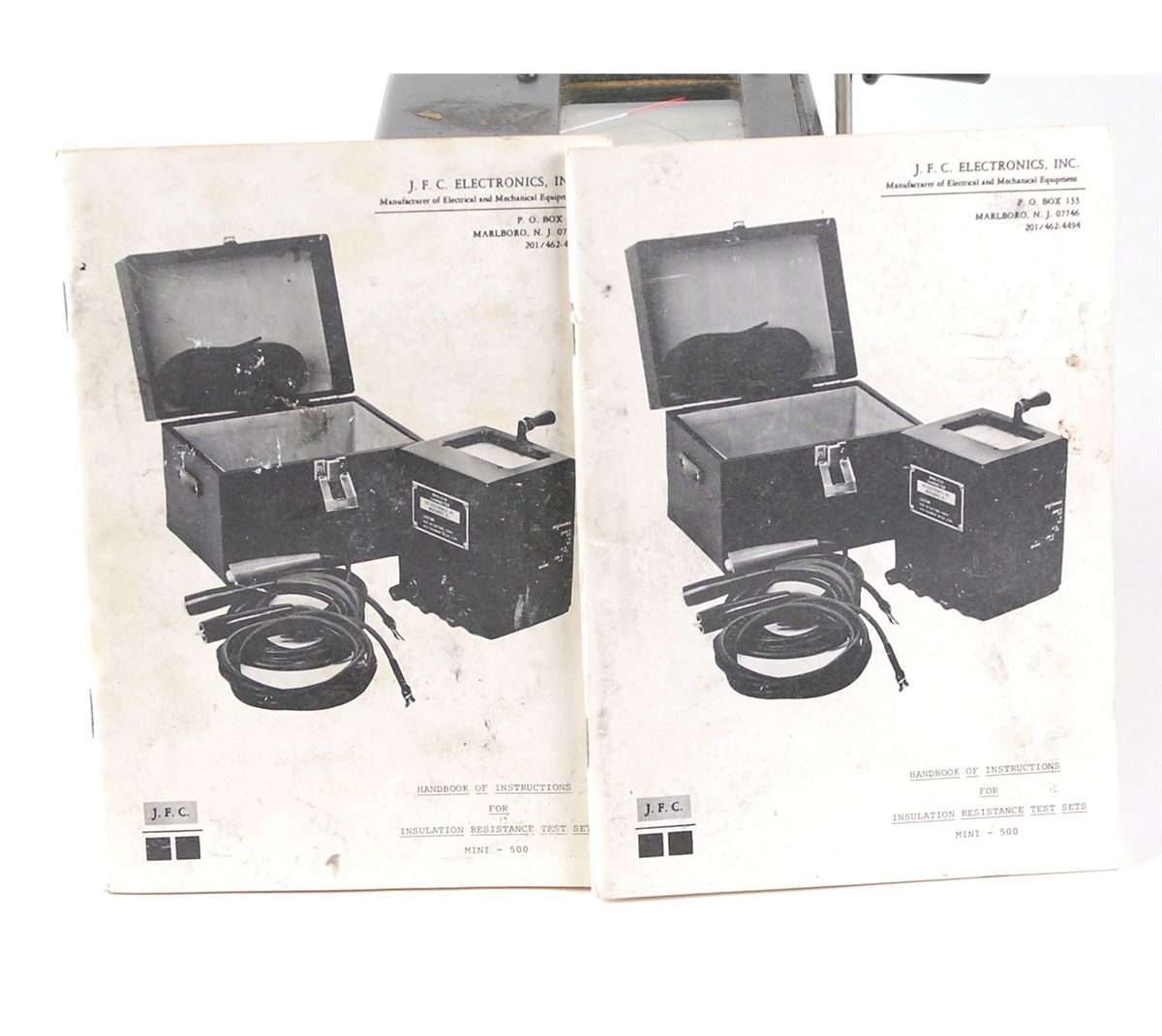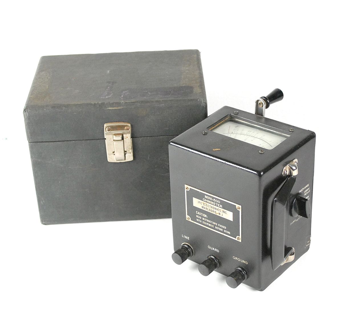 Mini-500 Ohmmeter, 5 x 6 x 4.5, made by JFC Electronics Inc. of Marlboro, New Jersey. Meter has connections for Line, Guard, and Ground, hand crank, and meter. Device comes in its original case and is complete with directions. In fine condition.