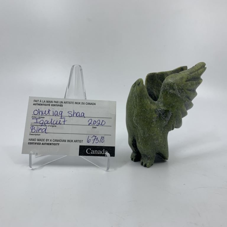 Ohutiaq Shaa's "Bird" original aboriginal sculpture. Carved from stone, from the town of Iqaluit in 2020, and included with its certification tag from the government of Canada. This sculpture is in excellent condition without any signs of cracks or damage. 67310
