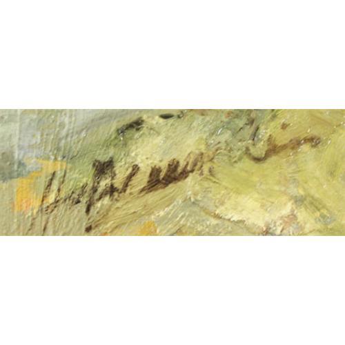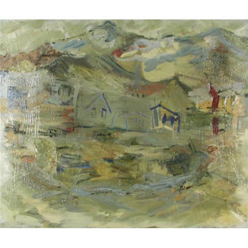 Illegible, Oil & Collage on Canvas, Pikes Peak from a Manitou Springs Street, 20" x 24", signed lower right, circa 1960s, Colorado Springs Fine Arts Center tag attached stating Exhibition: Rental Gallery 1970