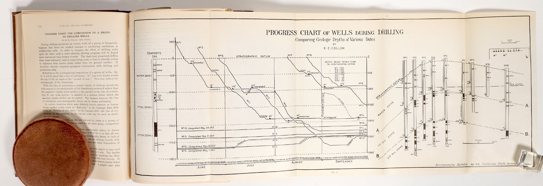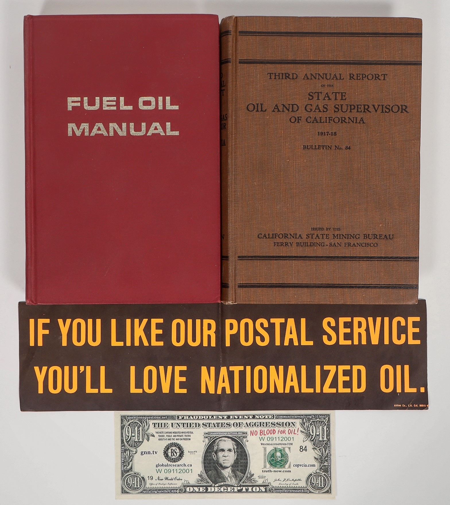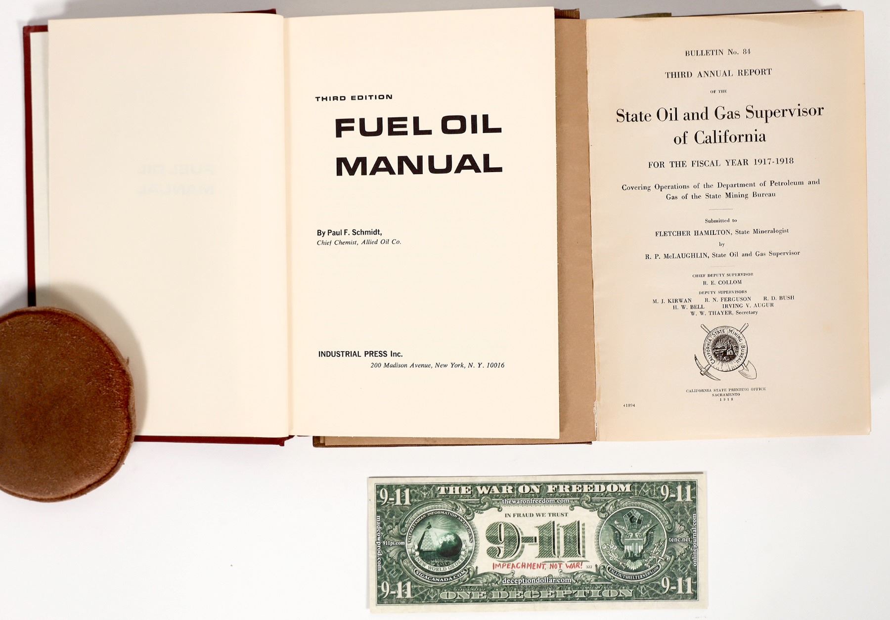 A pair of technical books on the oil and gas industry: 'Fuel Oil Manual, 3rd Edition' by Paul F. Schmidt (1969) and 'Third Annual Report of the State Oil and Gas Supervisor of California 1917-18' by the California State Mining Bureau (1918). Both in good condition. Lot also includes two pieces of political oil ephemera: a vintage bumper sticker advocating for nationalized oil and a satirical fake dollar bill denouncing the Iraq War.