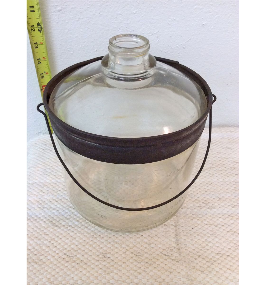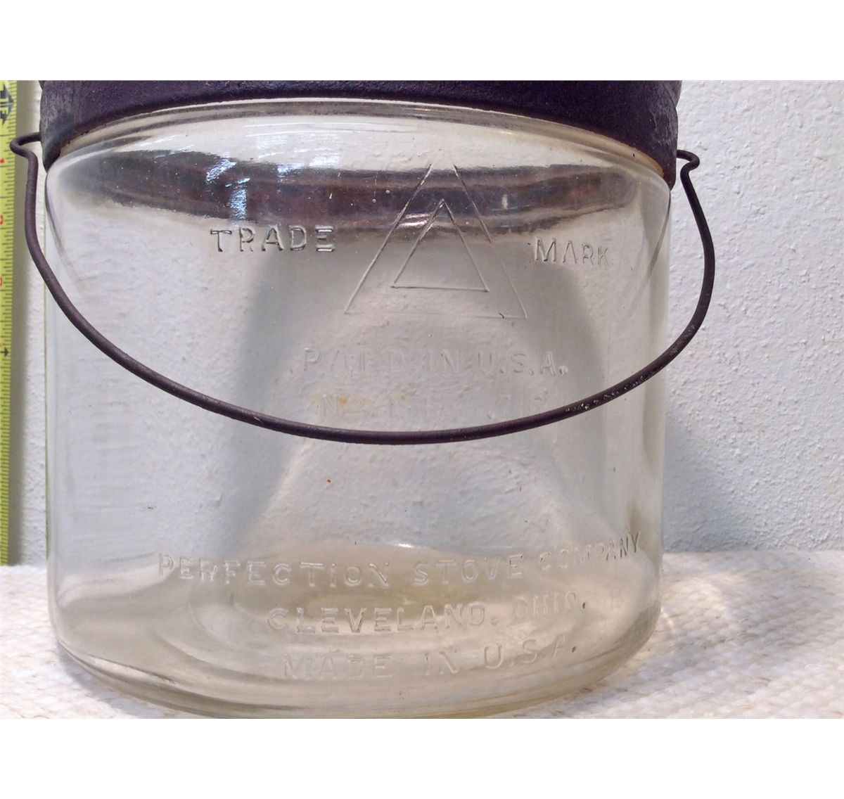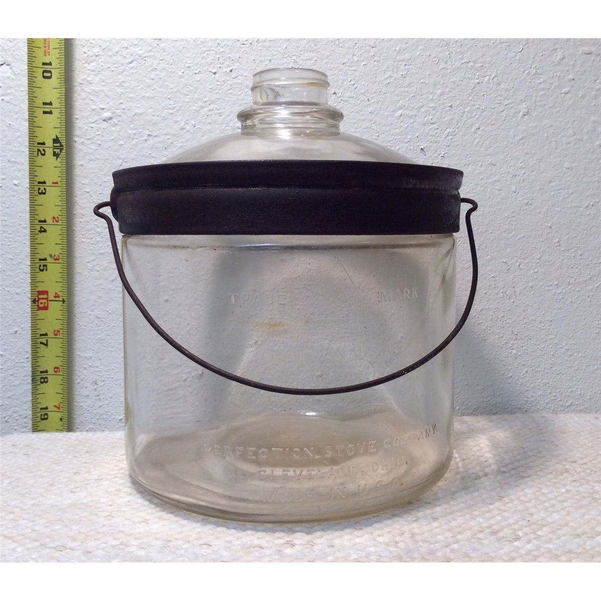 Antique Perfection Stove Co Kerosene Oil Glass Dripper Jar Metal Handle missing Spout - Normal wear from use and aging over the years