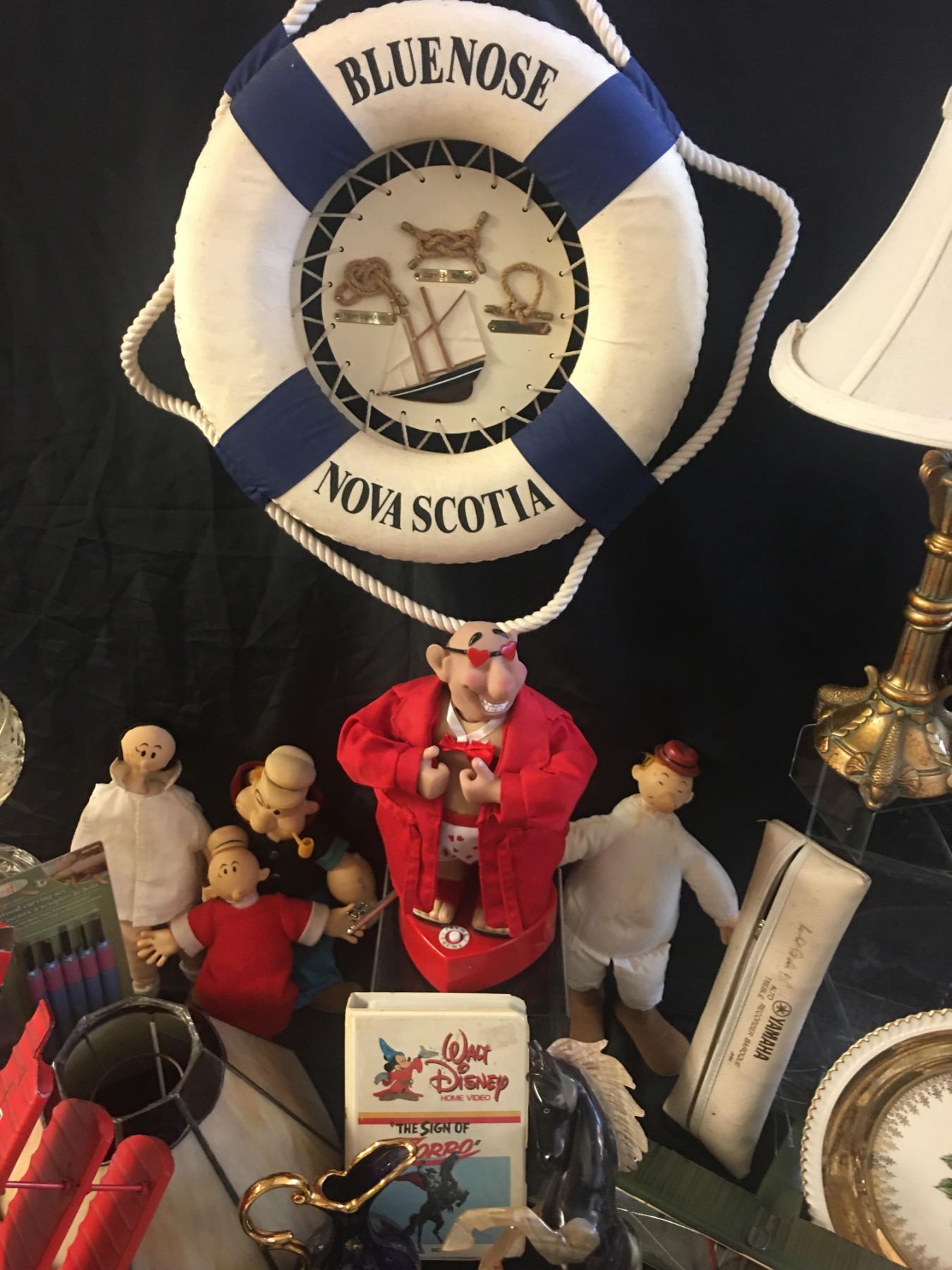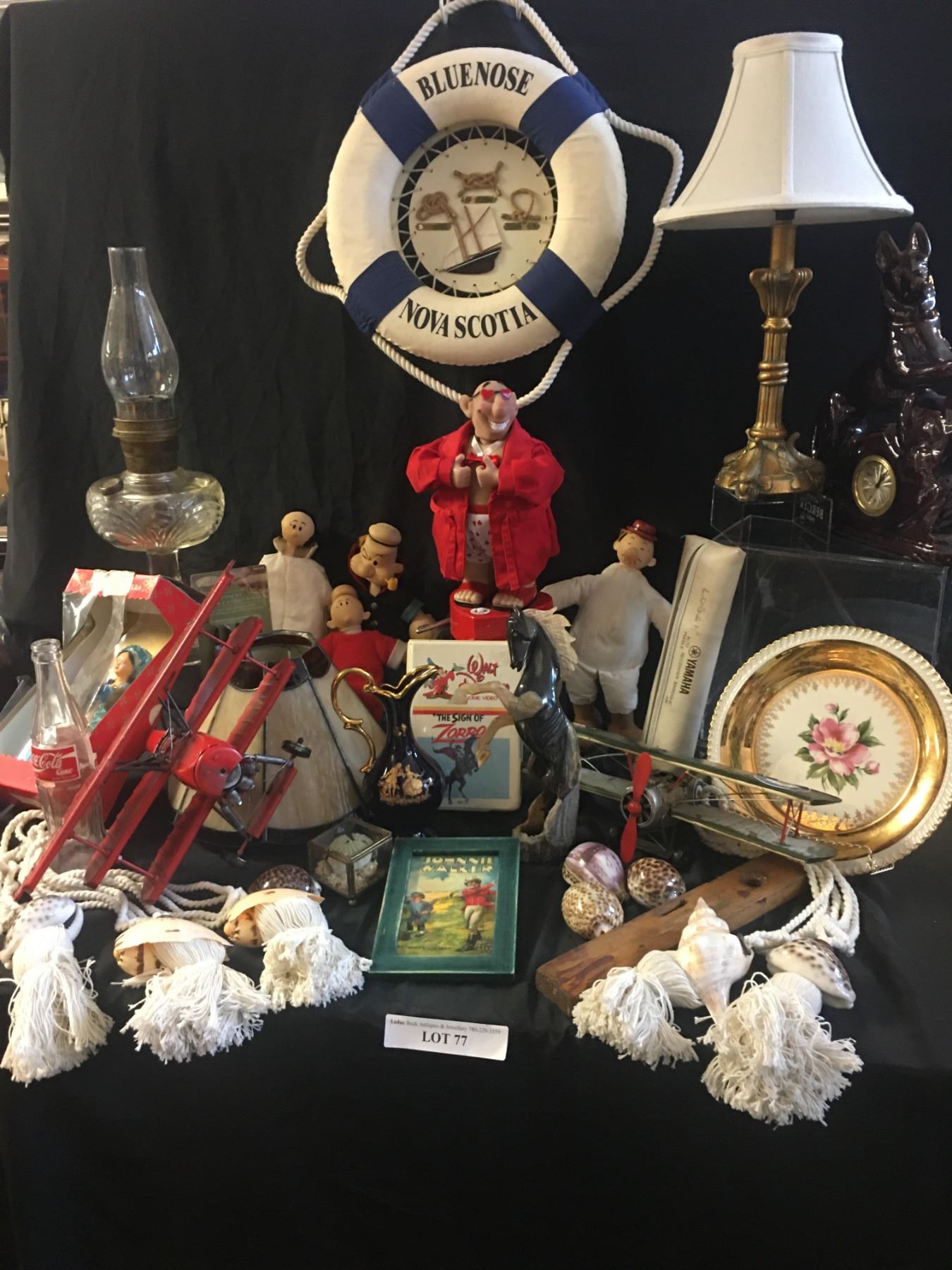 Oil Lamp, Bluenose Life Preserver Wall Decor, Shell Tiebacks, Shells, Cola Cola Bottle, Johnnie Walker Picture, 2 Planes, Horse, Sign of Zorro, Popeye/Olive Oil Dolls & Vintage Catherine Nisbet Catherine Parr Doll