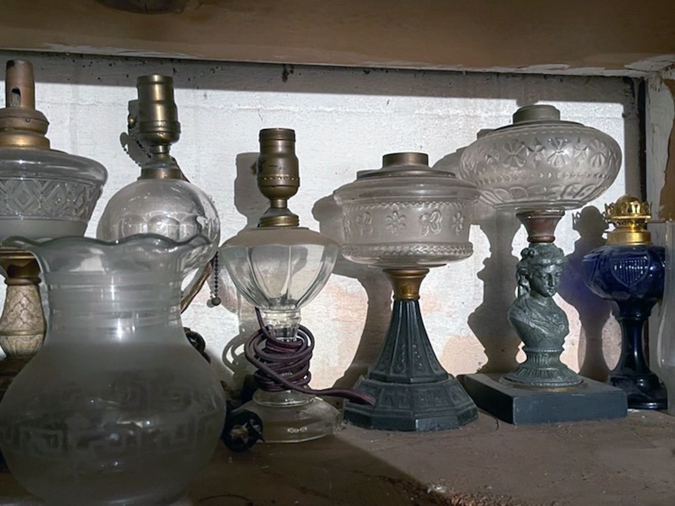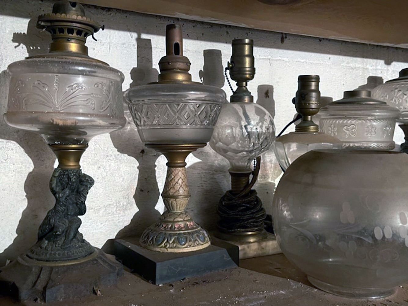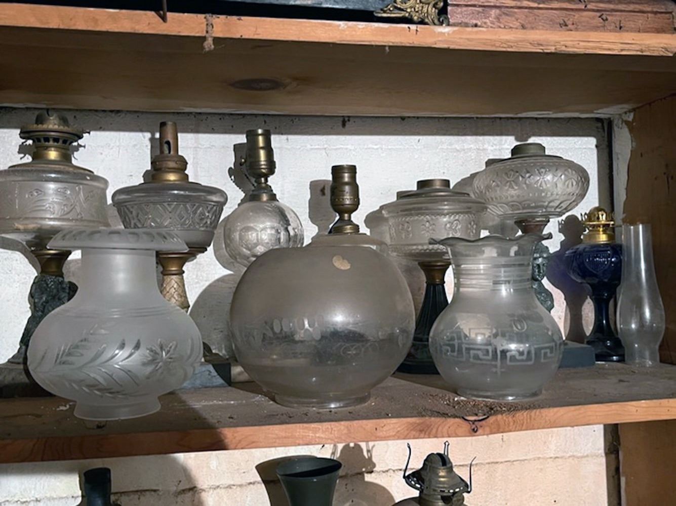 Oil lamp collection with early globes, from the lifetime collection. All from what we named the mystery room, the family never realized it was there and we had to break in to get in. Selling as found!