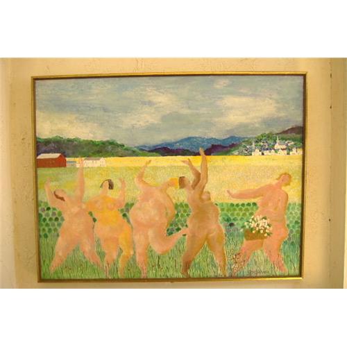 An oil painting on canvas with a wood frame. One of a series of artist William Schommer,ladies doing activities while nude.