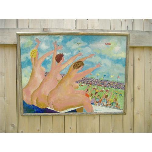 An oil painting of the Ladies taking a day to watch a Football Game, one of a series by William Schommer of Ladies activites in the nude.