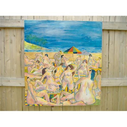 A large oil painting of the Ladies taking a day at the beach. One of a series by William Schommer of Ladies activites in the nude.
