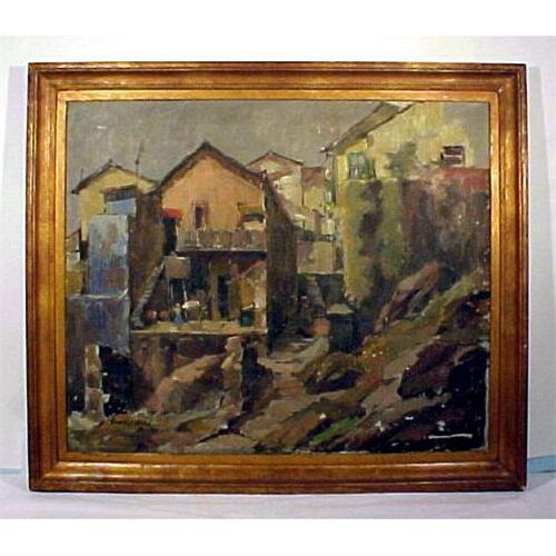 This is an incredibly interesting painting ? it is entitled RIO 1967 and is signed Geraldo F. Castro in the lower left hand corner. The colors of the painting are a muted pastel which gives the painting an overall comfort not to mention great dimension. The brush strokes are extraordinary. The painting has several paint flicks, with the heaviest concentration being in the lower right and left hand corners - this occurs because the canvas was improperly prepared before applying the paint, but I know he is a listed artist ? I recall seeing the name - but I haven?t done any further research. The painting measures 29 5/8?w x 25 ½?h and the site size is 25 ¼?w x 21?h.