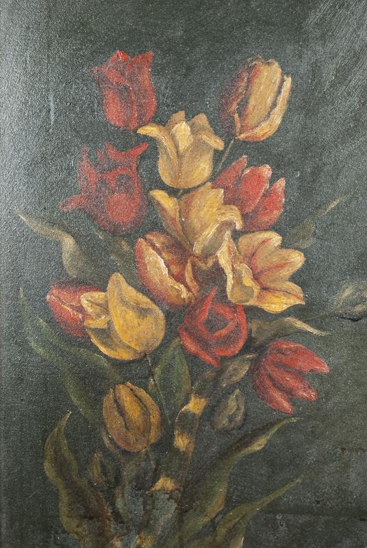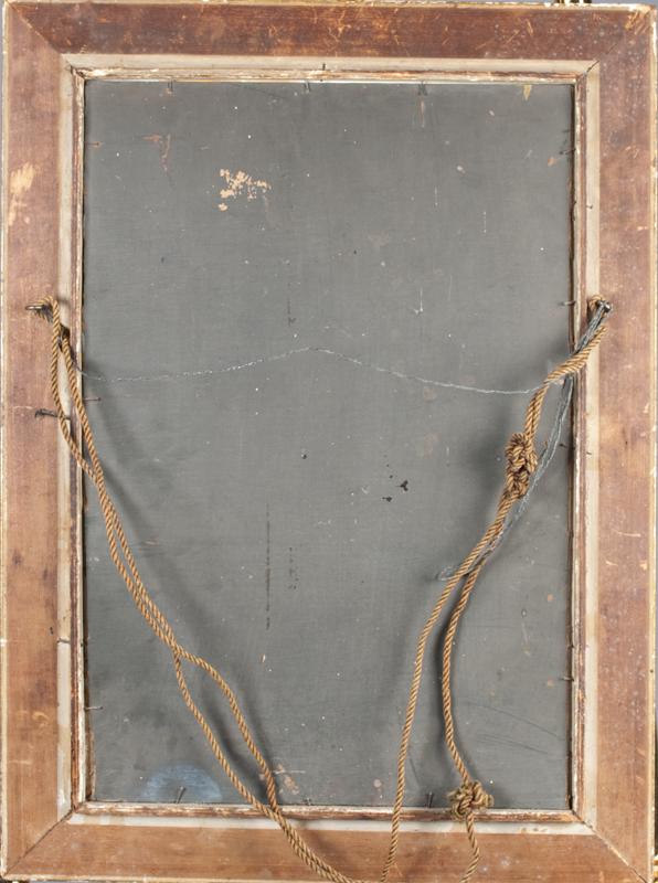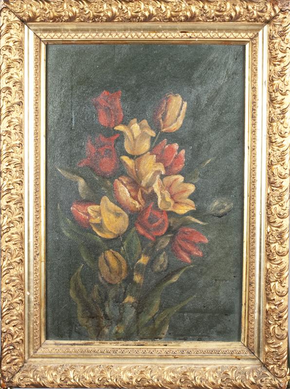 Finely painted to depict a bouquet of flowers, unsigned, 18"H X 12"W sight, 23"H X 17"W frame, mounted in a wonderful carved wood and gesso giltwood frame, circa 1880.