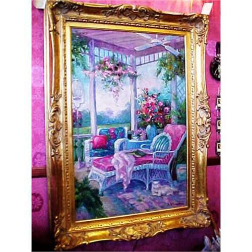 The "Perfect Sun Room" painting invites you to come in and R-E-L-A-X. Read a book on this lovely wicker lounge chair as you surround yourself with the scent of beautiful flowers, peace and tranquility. This impressionistic painting does all that! Signed J. Veveau. The frame is an exquisite gold gilded wood frame.