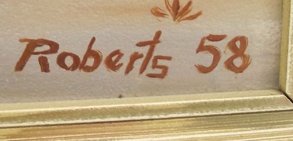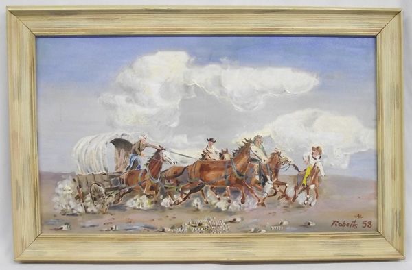 Oil Painting Runaway Covered Wagon - Roberts. We believe this exciting original oil painting is by Colorado artist, Jack Roberts. It is signed in the lower right corner, ''Roberts 58''. We have not been able to verify that this is indeed Jack Roberts, but the biography and genre of artwork by Jack Roberts matches this painting and era. It measures 13.5''H x 23.5''W and is in a wood frame. According to a press release by the Colorado Mountain College, Rifle, CO eNews: ''Jack Roberts was a self-professed ''flawed character'' whose struggle with alcohol plagued his early years. As a young man, he married a creatively gifted woman, fathered a son (Miller), then left the family and moved to western Colorado. ... In his studio south of Redstone, Roberts created as many as 40 paintings a year. Public collections of his work can be seen at the Museum of Western Colorado in Grand Junction, the Leanin' Tree Museum in Boulder, the Colorado Press Association in Denver, the Glenwood Hot Springs Lodge and Spa of the Rockies, U.S. Bank and the Redstone Castle. The Citizen Telegram also has a few of Roberts' works hanging on the walls.''