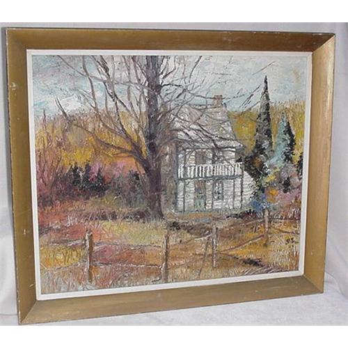 An unsigned oil painting on canvas, 23 1/2" X 27 1/2" framed. Autumn colors surround the white two story house. (6)