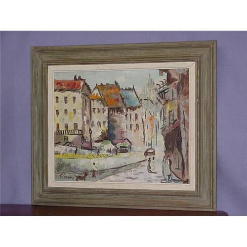 A framed oil painting, 27" X 23", painted on canvas, a street scene of row houses with several figures in the foreground. The painting is signed "Flouner" in the lower left. (6)