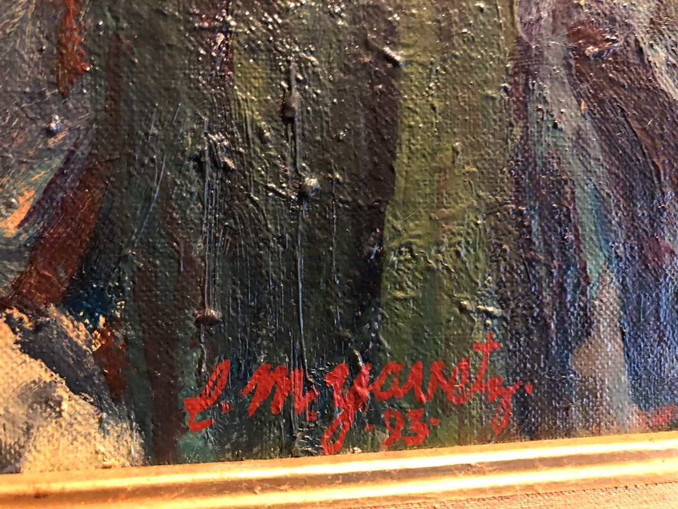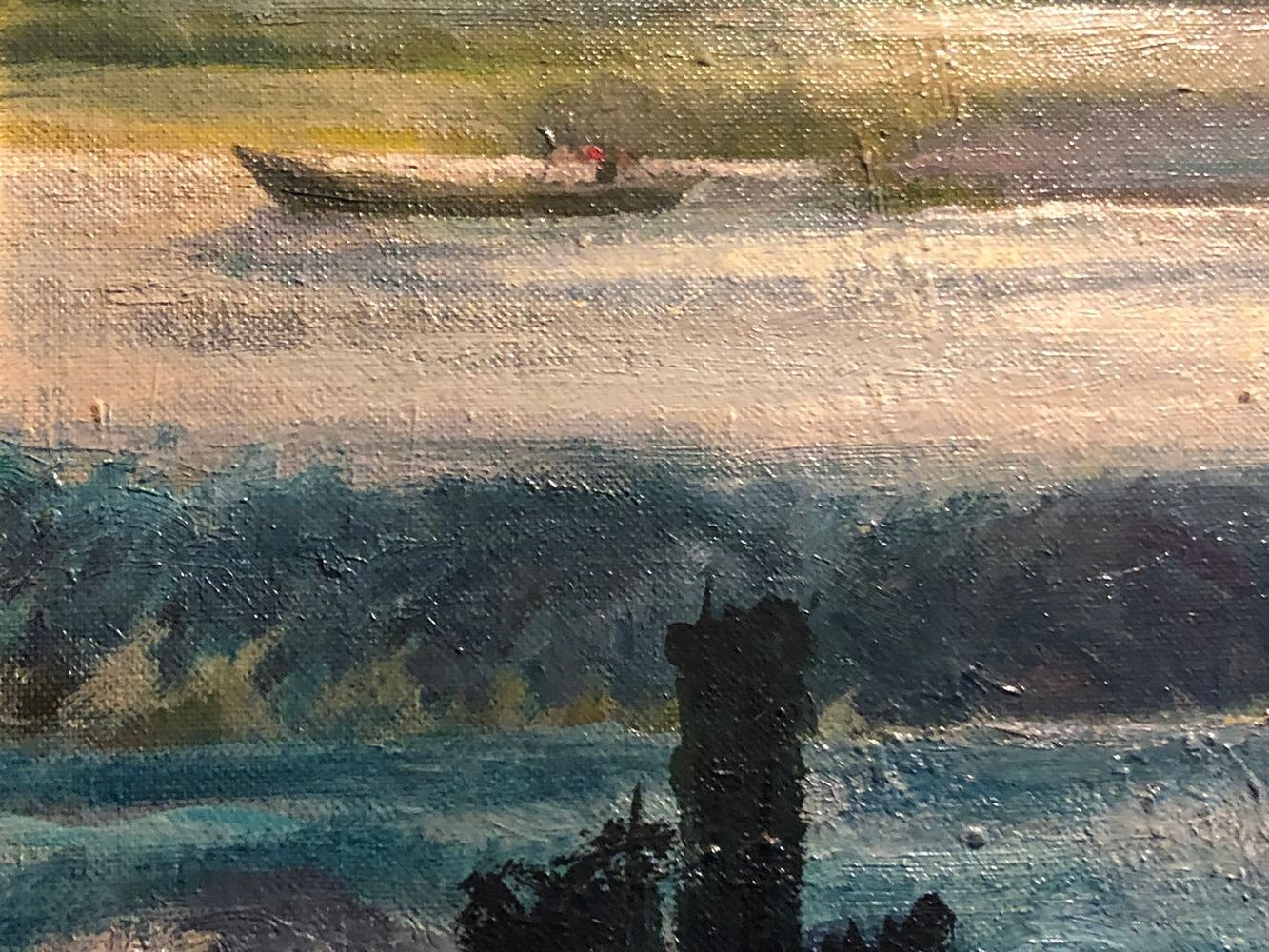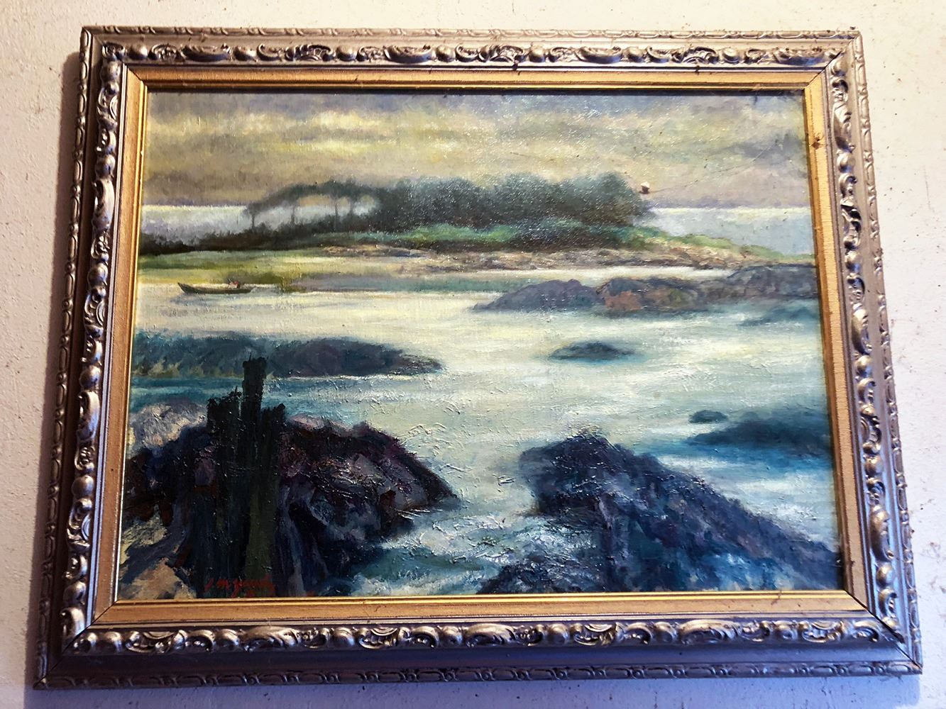 Oil painting, signed L. M Yavetz '93, seascape with man in canoe, framed. pd estate