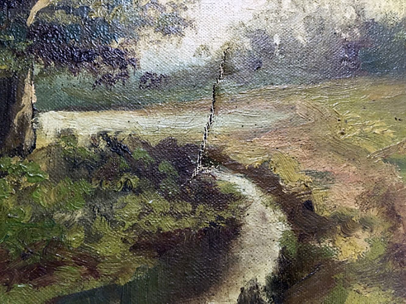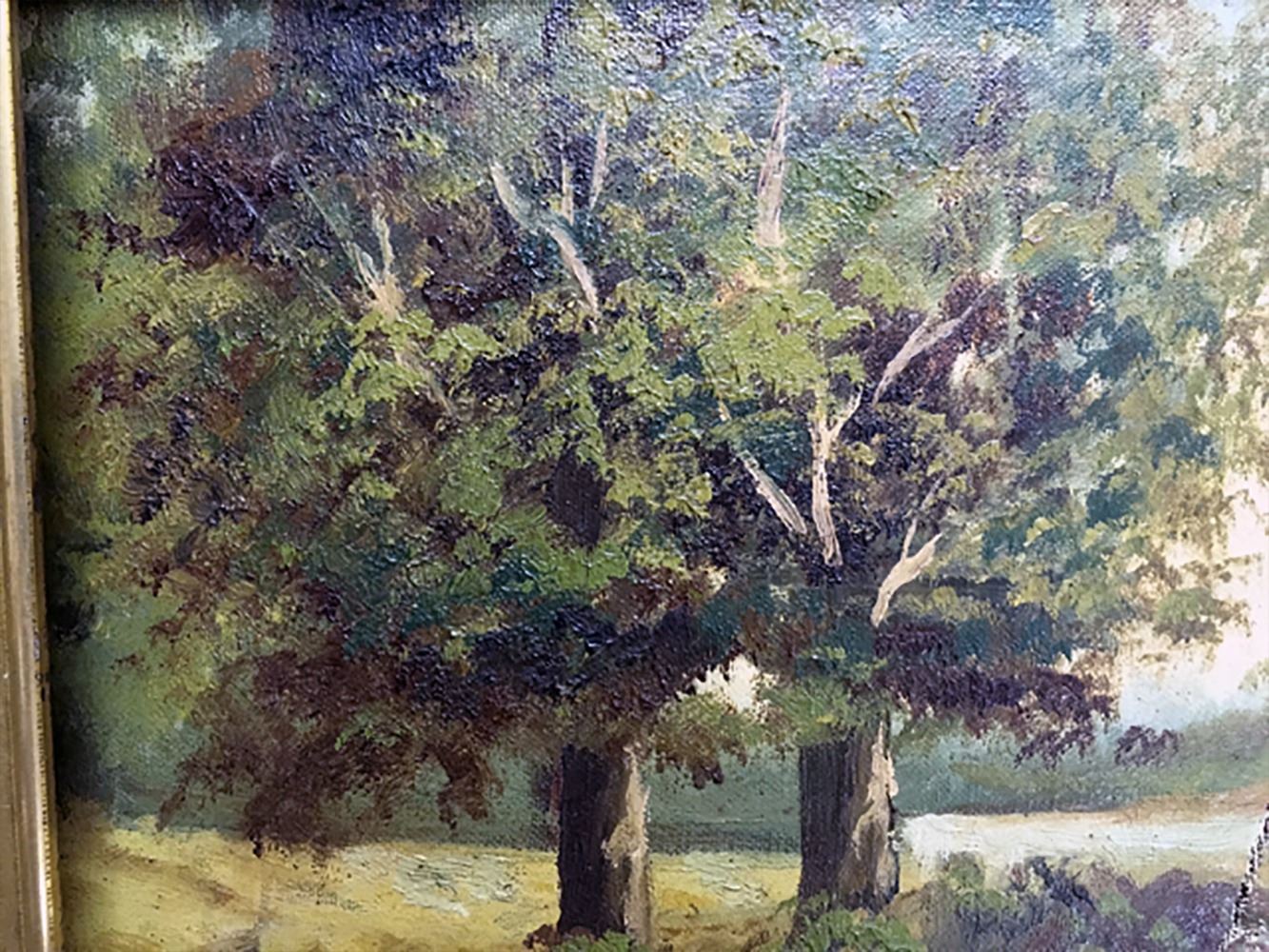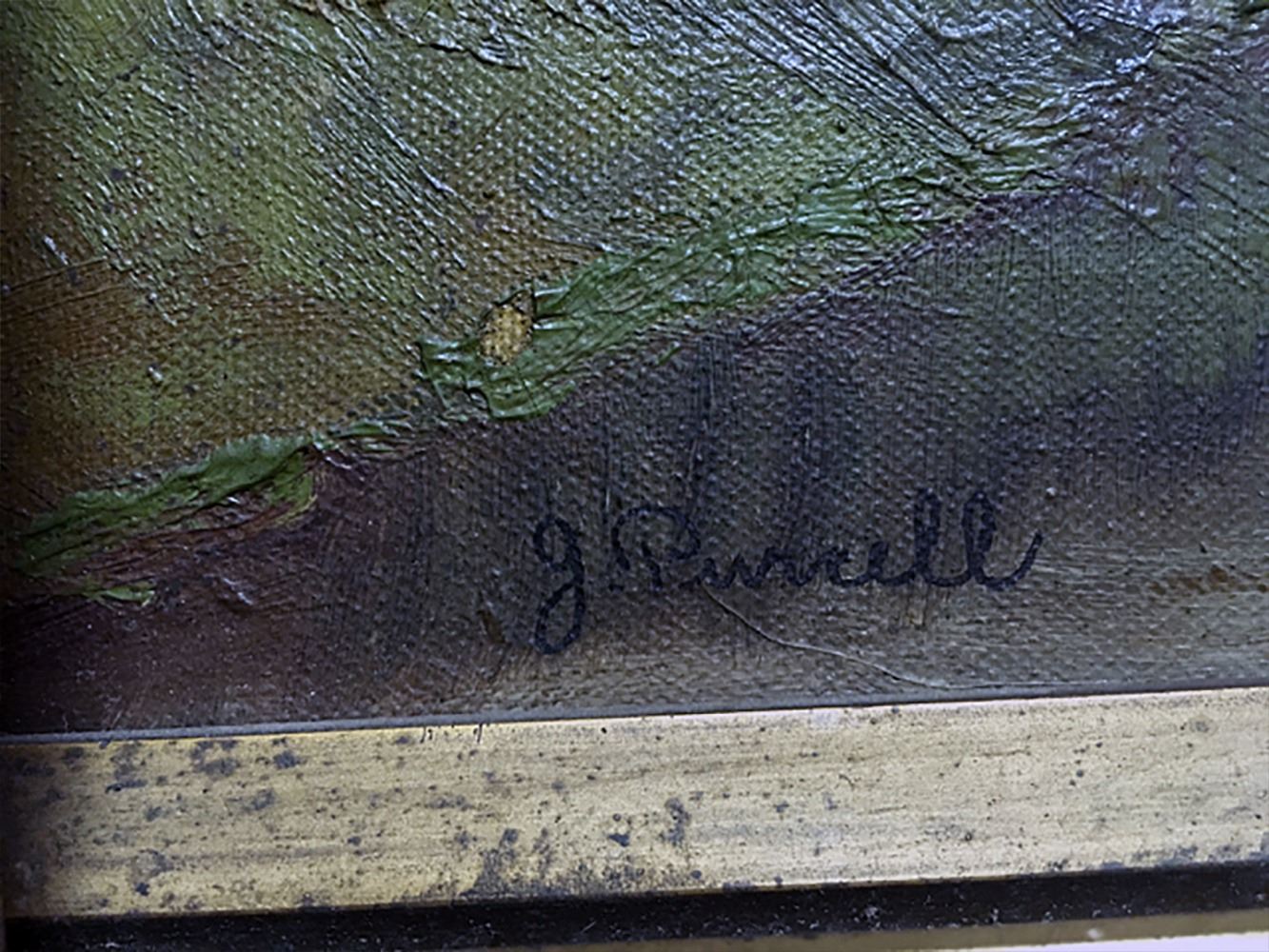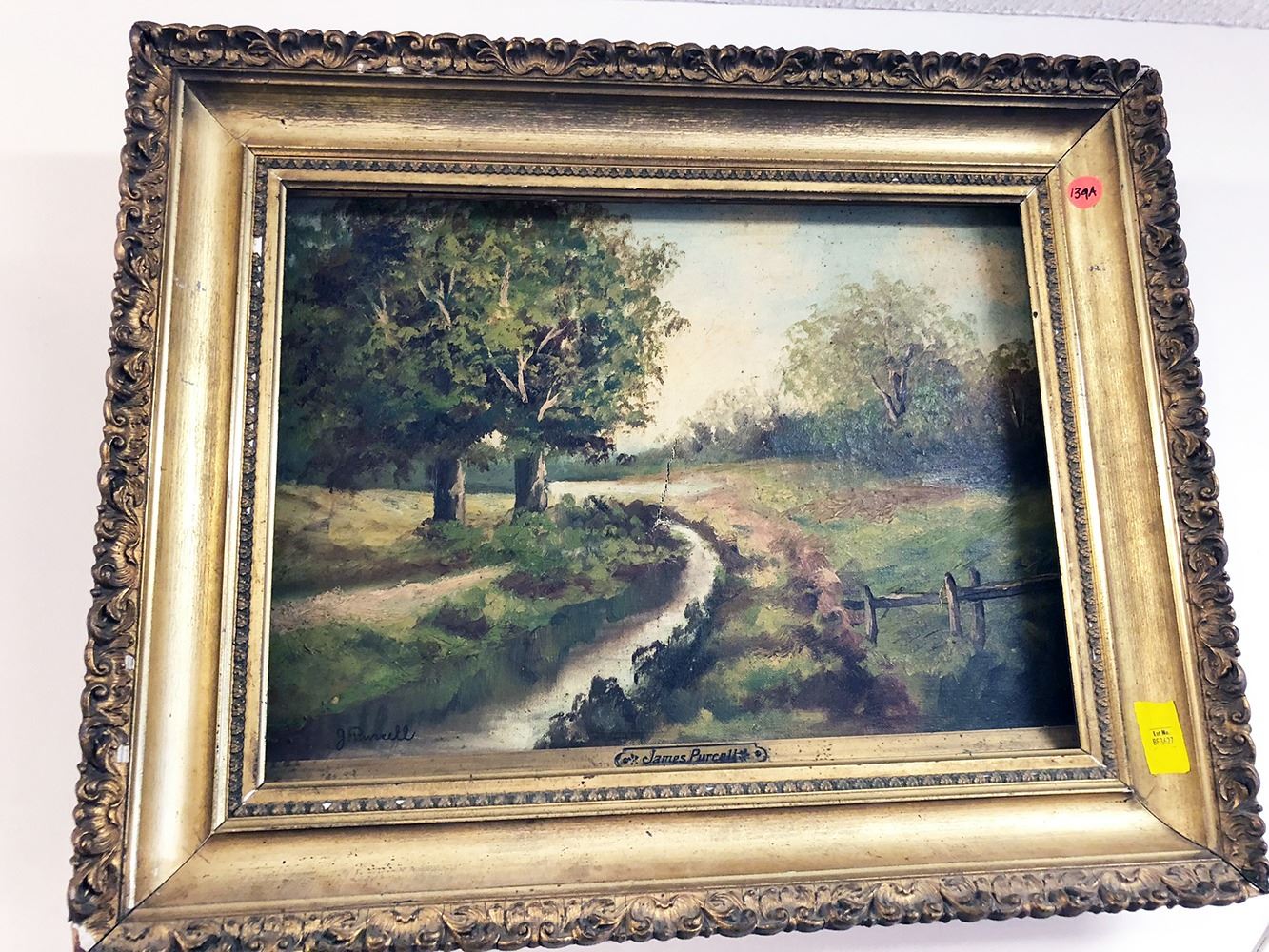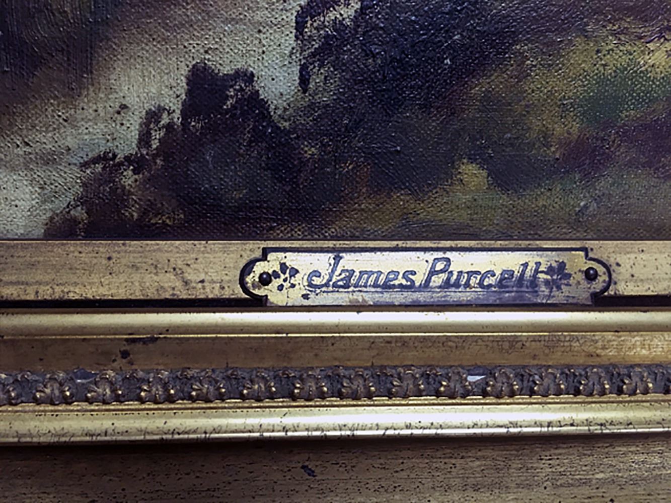 Antique estate oil painting in gold gilt frame, landscape signed James Purcell with plaque on frame "James Purcell". Oil on canvas, measures approx. 21 1/2" wide x 17 1/2" tall. Small tear in canvas that can easily be repaired. Very nice antique landscape oil painting.