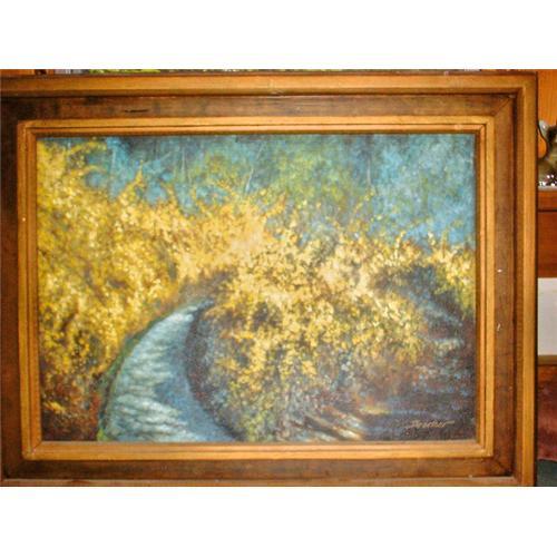 This is a very nice, framed oil landscape of a country lane bordered by flowering Forsythia. It is oil on canvas. The style is a reminder of the Impressionists. The paint is thin and transluscent. The colors are bright and clear. This is a lovely little painting. It is signed Doscher. The frame is a simple wood frame. The size with frame is 21.5X16.5, without frame it is 18X13. Please feel free to ask questions. Your satisfaction is my main concern.