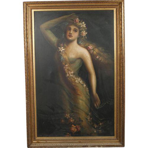 Oil Painting "Standing Girl w/ Flowers" Unsigned 37 x 57 " very minor repairs