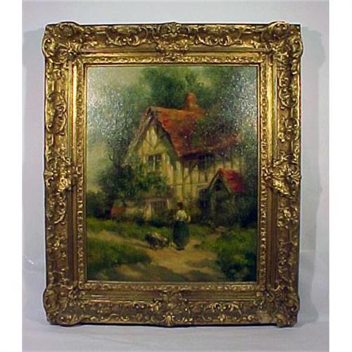 This is an incredible piece of art! The painting is remarkable not only in affecting mood but the colors, flow, and dimension give an ambiance that is hard to verbalize. The frame is very complementary in a rococo style that is carved wood gesso and gold gilt. It is so incredibly complimentary to the painting that it takes my breath away! It is signed Henry T. Harvey. Henry T Harvey is a listed artist though there is very little written about him ? all I was able to uncover is that he was born in 1908 and that he was British. It surprises me to find so little on this artist due to the grand work done in this painting ? his ability and his eye for integrity and beauty are unsurpassable. The reverse is stamped with a copyright notice and the title is listed on the stretcher ?The Old Cottage? along with the number 6943 and again the artists? name HT Harvey. It measures 27 1/8?h x 23?w and the site size measures 19 ¼?h x 15 ¼?w. The condition of the painting is perfect! There are no restorations?there was a piece of cardboard on the back that I took off to inspected the canvas which is perfect. There is a piece missing on the lower right hand corner of the frame that measures approximately 2 ½? long. I absolutely love this painting and I can?t think of a room that it wouldn?t look perfect in. As I said before it is an incredible piece of art!