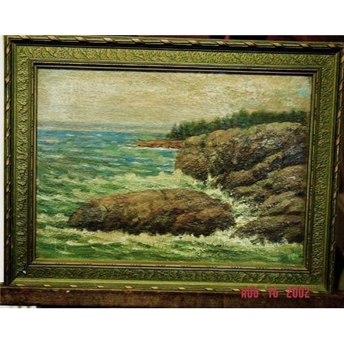 </font></strong>This is a great ocean painting- you can almost hear the waves crashing on the rocks! The framing is an excellent touch to the painting-it has a blue/green tone.