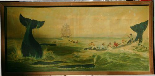 Whaling picture. Oarsman in small boats are surrounded by large whales with large ship in background. Measures 87" X 44". Signed by Dominic Staltari.