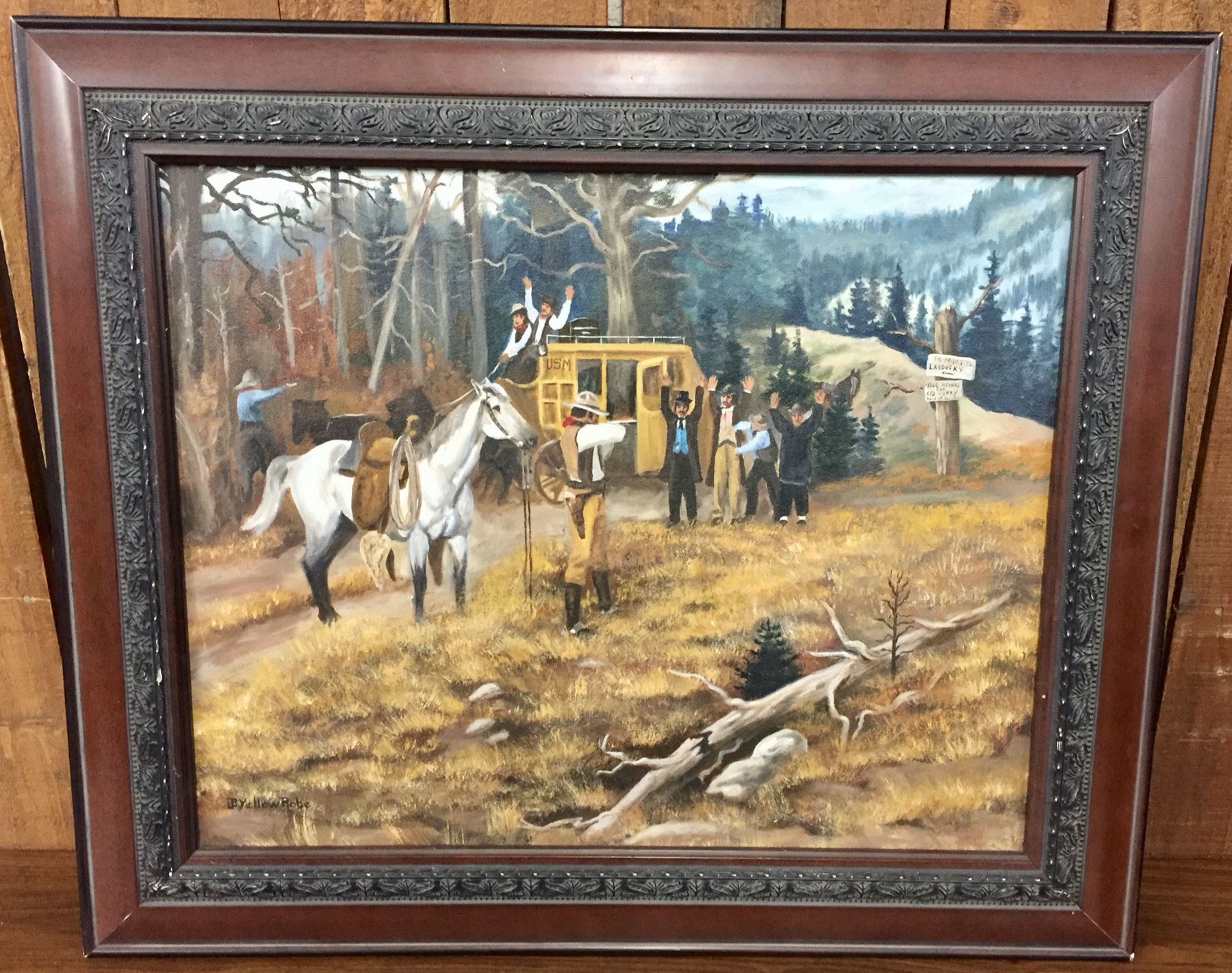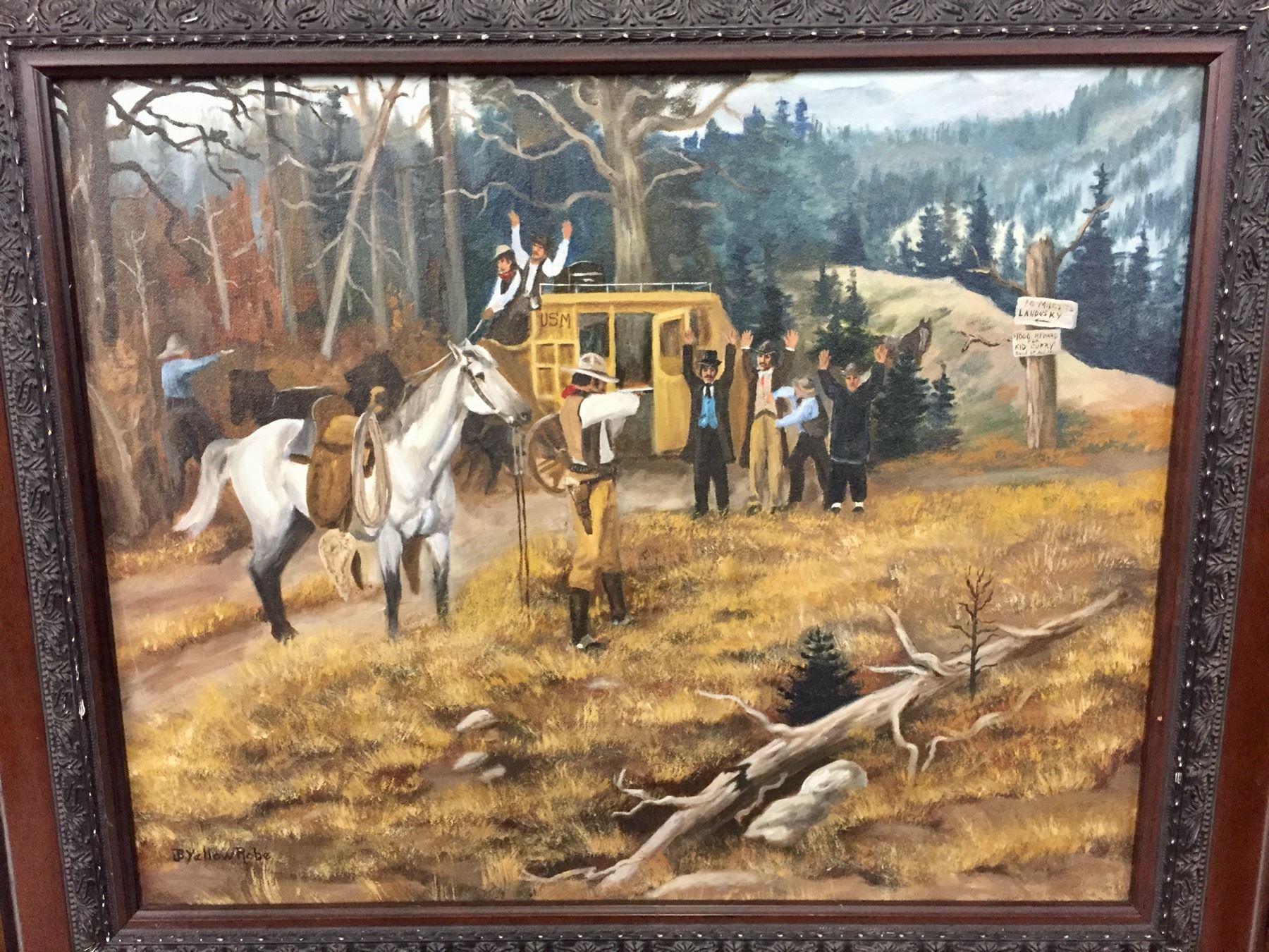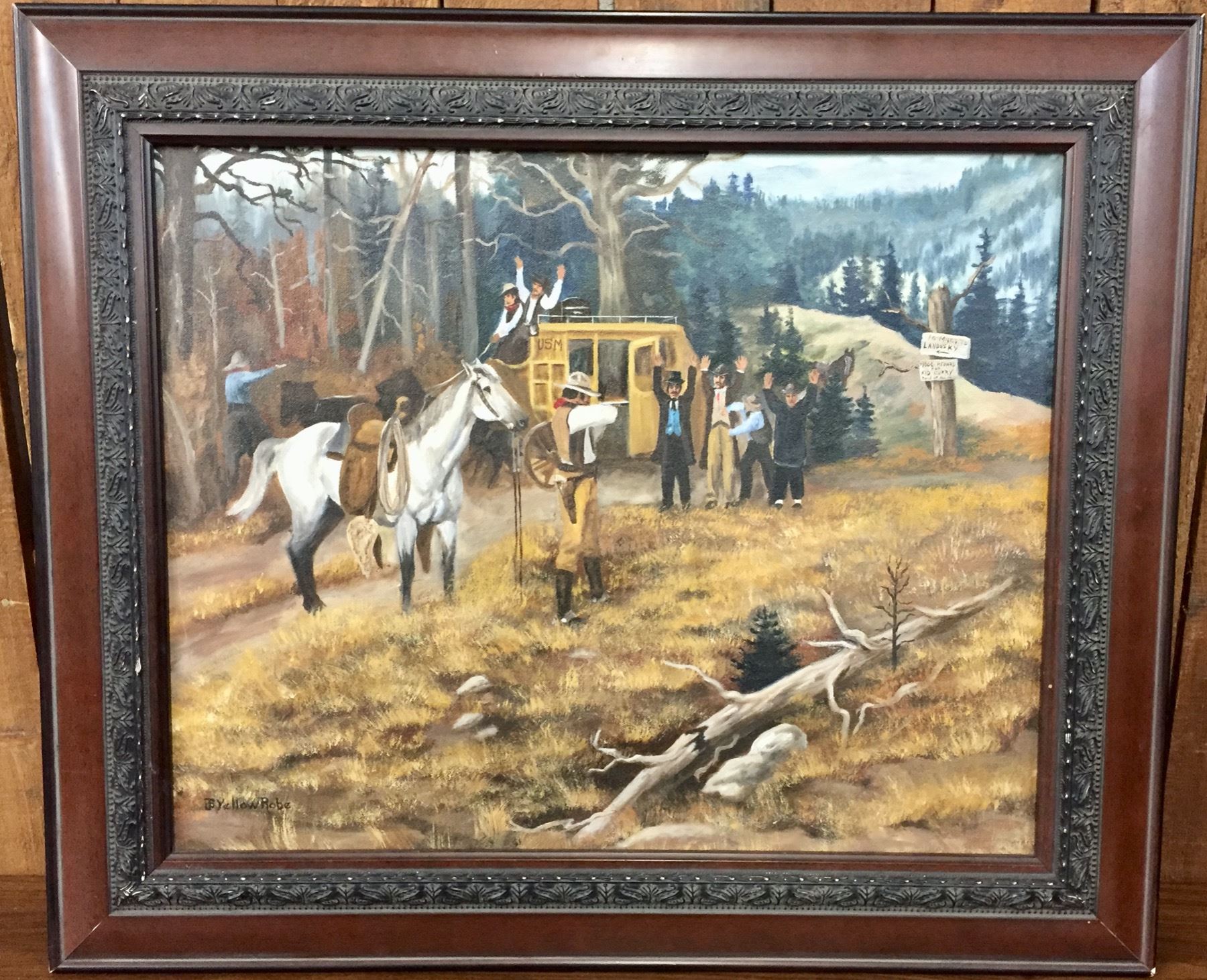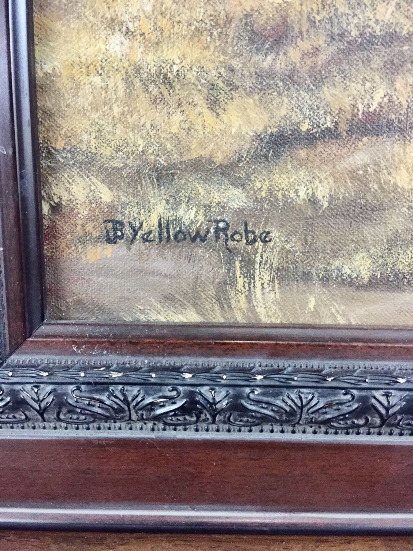 Description: Offered for sale in this lot is a detailed Western oil painting showning a cowboy holding up the stage coach. This original artwork was created by the known artist, JB Yellowrobe. Maker: JB Yellowrobe. Approx. Age: Circa 1980s or newer. Size: 16 inches x 20 inches with frame. Condition: Good for its age, normal wear expected. Please look closely at the pictures - they are an important part of our description. Shipping: There will be a $10 handling, packaging fee for shipping this lot. The actual cost of postage will be added on top of that.