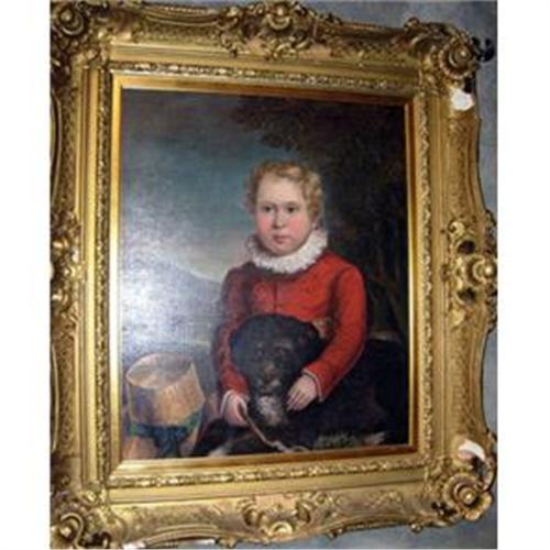 Oil Painting depicting a boy dressed in red and holding a dog. Oil on Canvas. 23 1/2" x 28 1/2". From "The Lodge" Hotel in Palm Springs. The frame is in need of major restoration. The painting is in very nice condition.