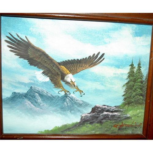 Oil Painting of Bald Eagle and Mountains. It is signed but I am not sure what it says. It looks like W. Amadia. The painting itself is on a board and it measures 10 1/8" x 8 1/8". With the wooden frame it is 16" x 14". The condition is very good as far as the painting goes. There is a couple to tiny marks that look like scratches. The frame is dinged up but it can be touched up.