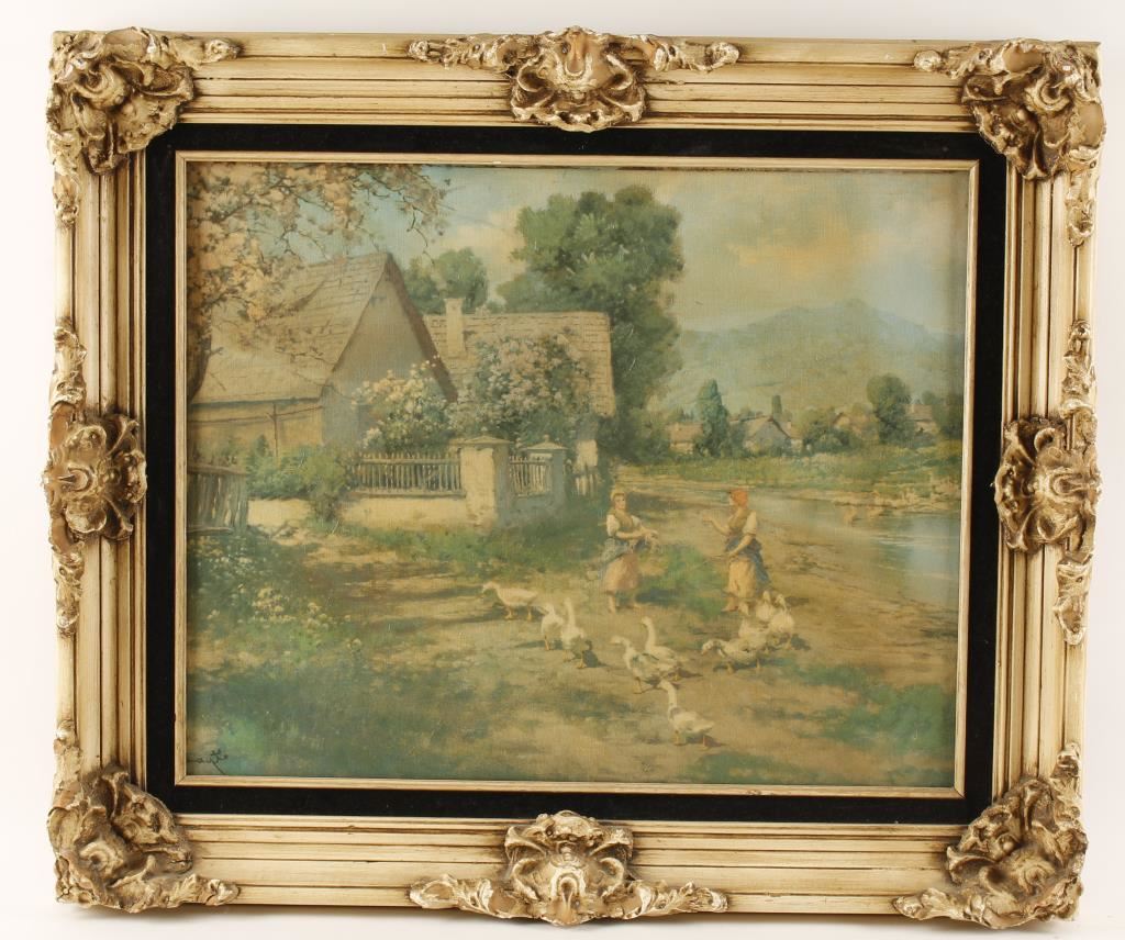 with Women Feeding Geese by Sayte. White molded frame shows age. Image size 15 1/4" x 191/2".
