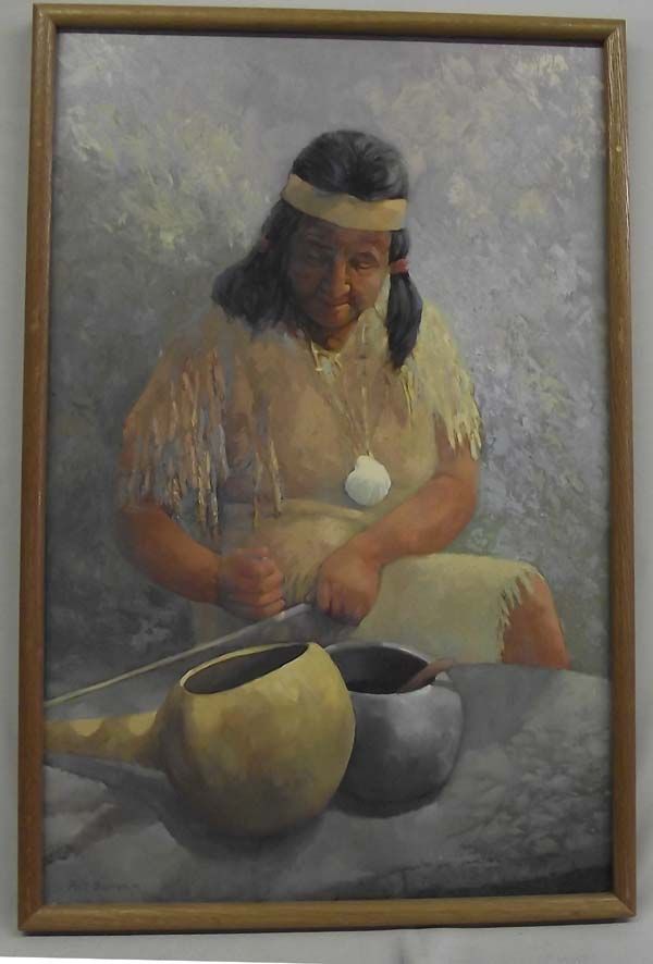 Oil Painting of Indian Maiden - Pat Barron. Original oil on canvas in wood frame. Signed by artist, ''Pat Barron.'' Measures 29.5''x19.5''.