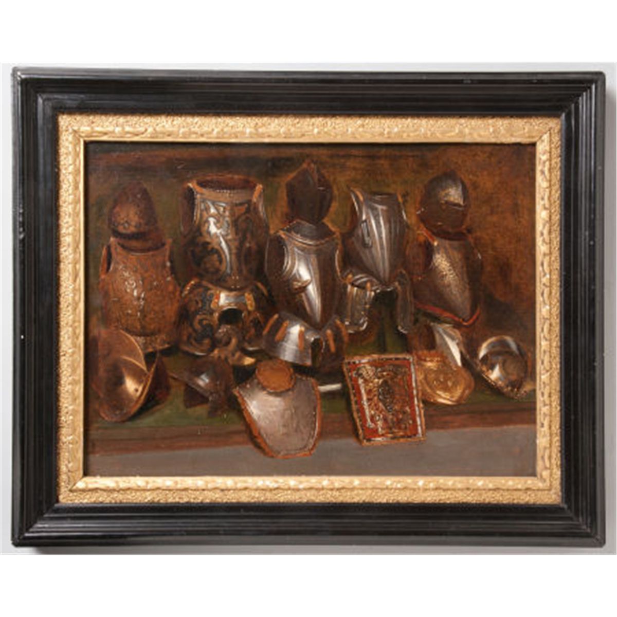 Oil Painting of Suits of Armor. The unsigned oil painting of a collection of armor. Nicely rendered. Framed in a black and gilt wooden frame. Possibly 19th-century. Size: 12-inches X 16-inches.Condition: Very good. Showing light age wear overall.
