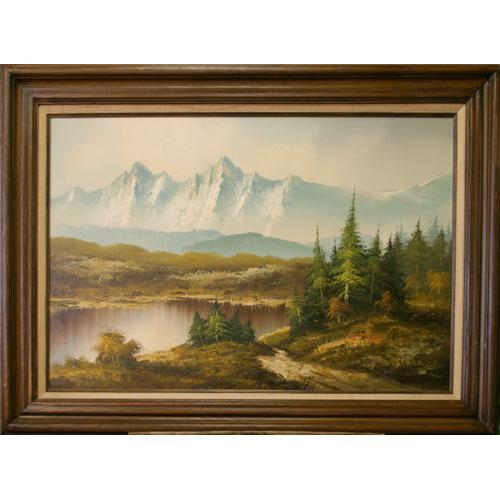Such a pristine view! This fantastic oil painting by P. Siman depicts a landscape with a winding road, evergreens, a mountain pond and majestic mountains looming in the background. The artist shows his amazing skill in executing fine details such as individual branches of the trees, reflection on the water and haze in the background making the mountains seem far in the distance, yet you know their grandeur. The paint is laid on the canvas thick like frosting on a cake. The beautiful natural wood of the frame compliments the romantic landscape of the image.  With the frame the painting measures to 32? x 44?.  Signed in the bottom right corner, this painting would be a great addition to any art enthusiast?s collection and is excellently priced.